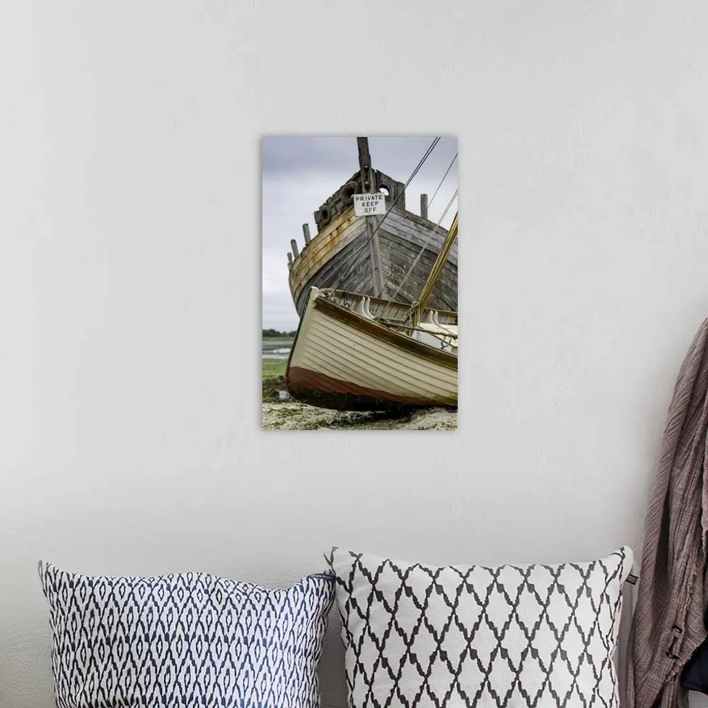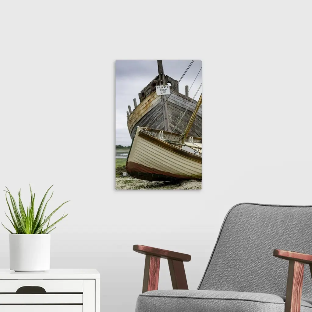 A small sailing dinghy beside a large rotting hulk of a boat.