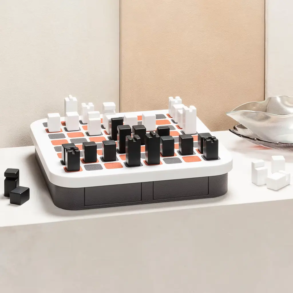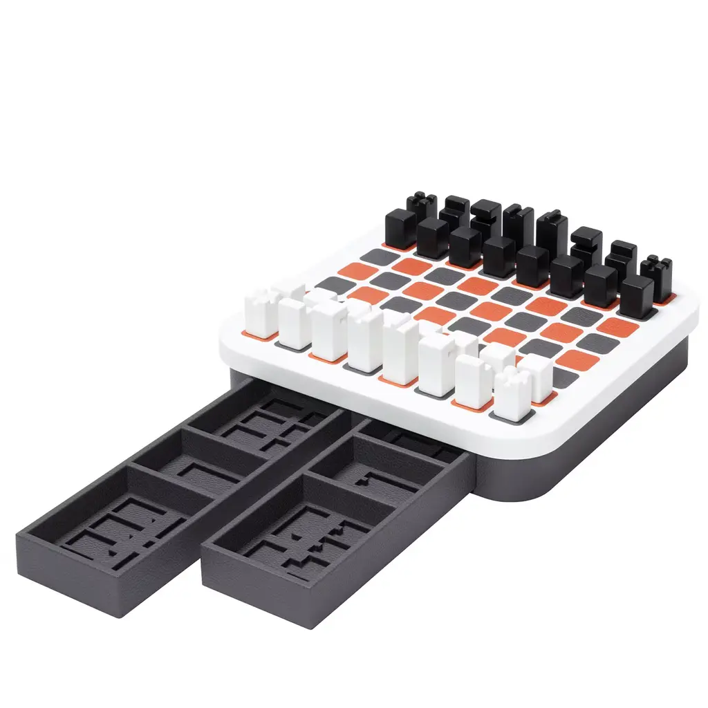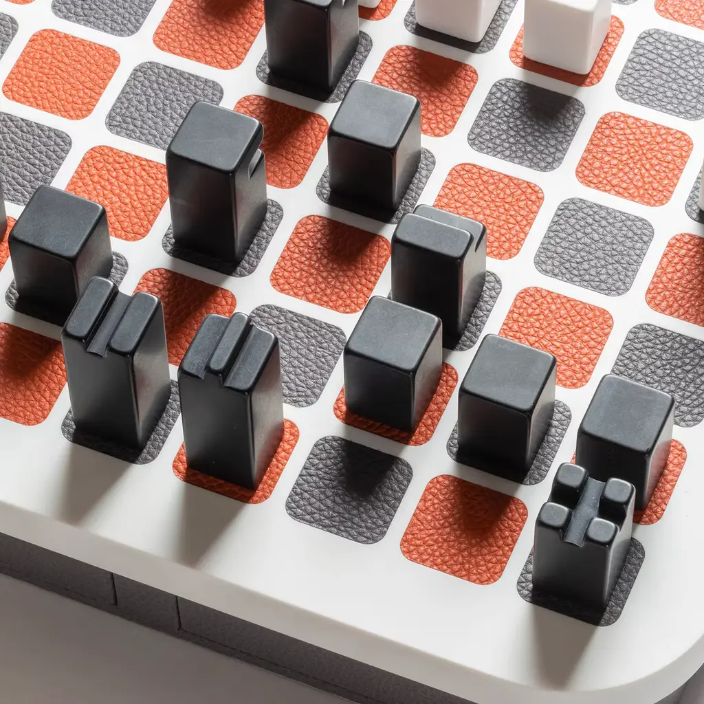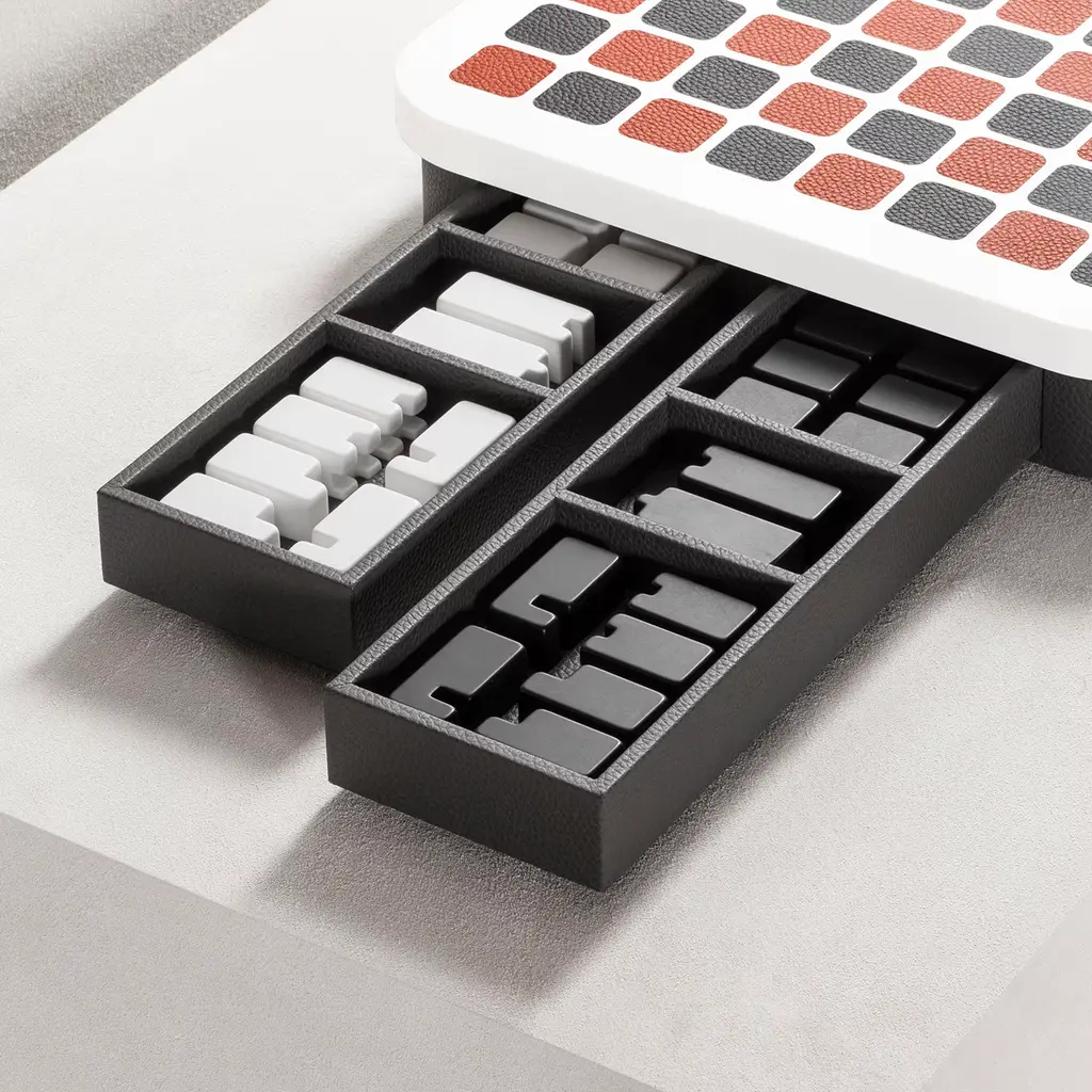 Corian® structure features fine leather inserts on top and a leather base provided with magnetic drawers with spaces to store playing pieces. The set is equipped with high-quality Corian® black and white pieces paired together. Corian® combinations: white & black.