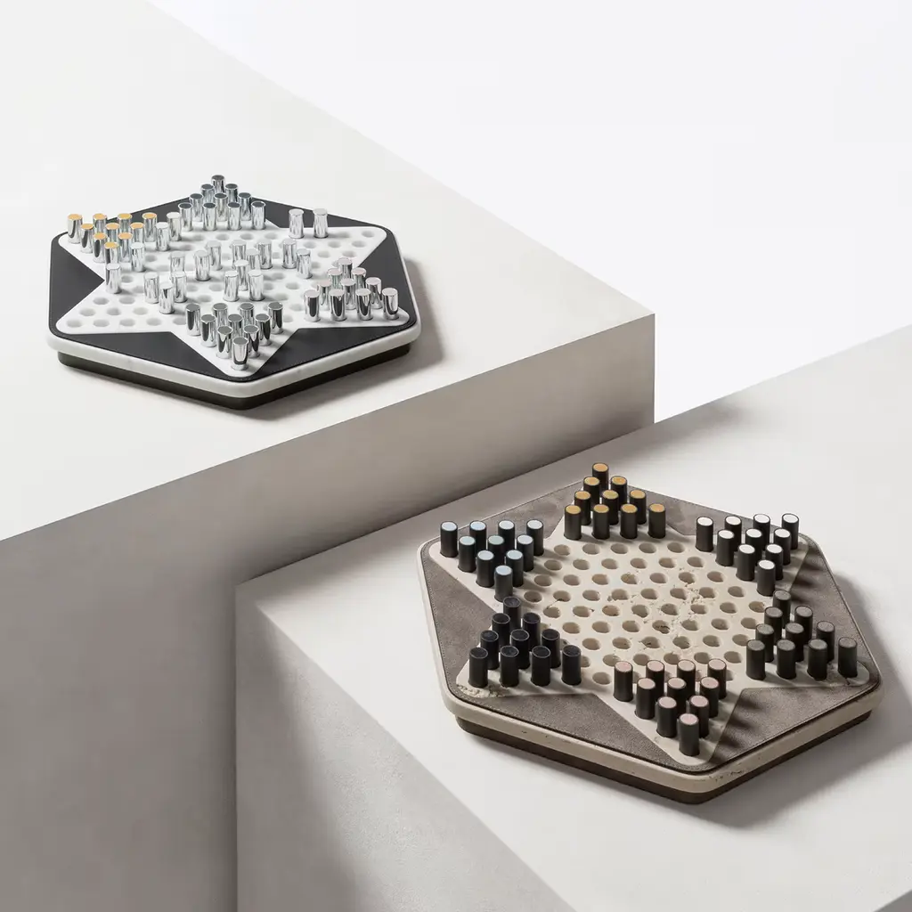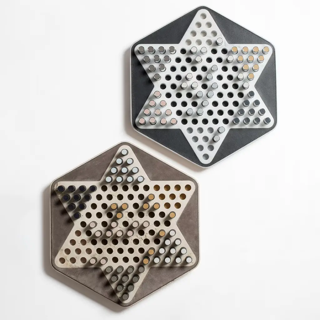 Partially leather-covered marble structure available in different finishes. The set is equipped with metal pieces featuring leather inserts.