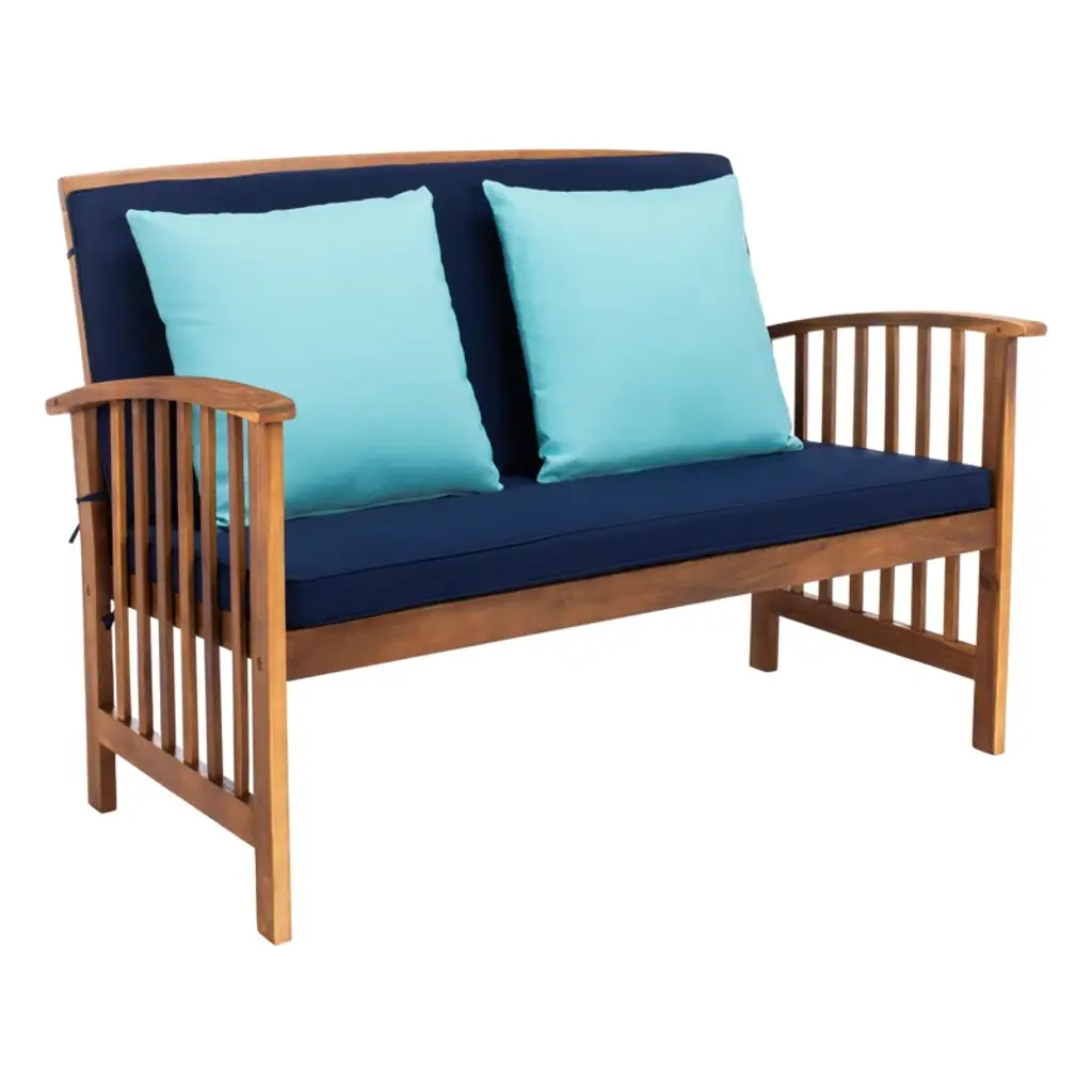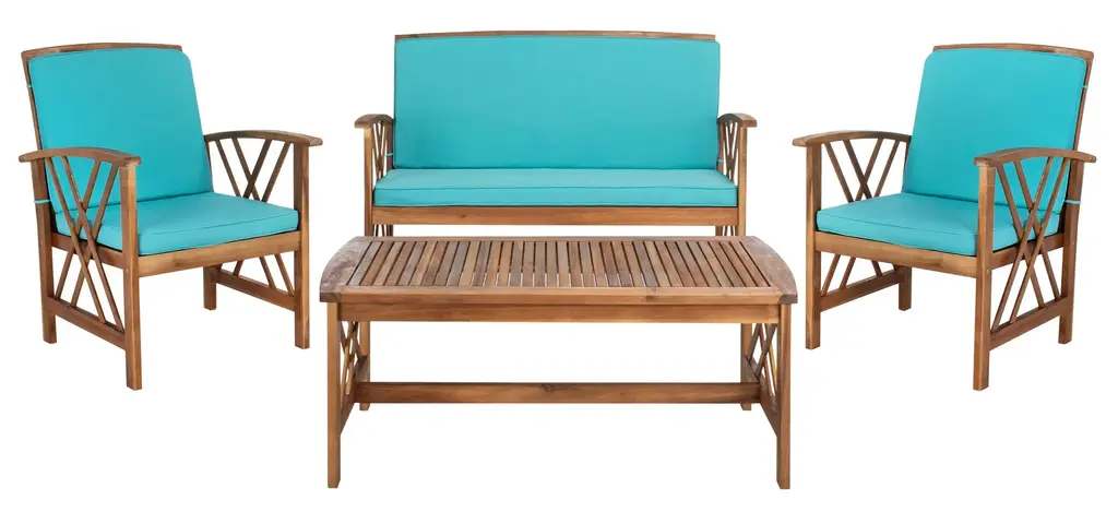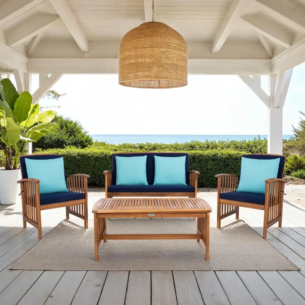 Gather around and enjoy the great outdoors with this classic outdoor conversation set. Crafted from solid acacia wood, this four-piece ensemble is weather-resistant and designed to last through all seasons. With seating for four, it includes two armchairs, a bench, and a table – perfect for patios, decks, and balconies. Water-resistant, foam-filled cushions ensure a cozy experience, while machine-washable cushion covers make for easy maintenance. To keep this set looking its best, we recommend storing it indoors or covering it well when not in use. So, sit back, relax, and let the good times roll!