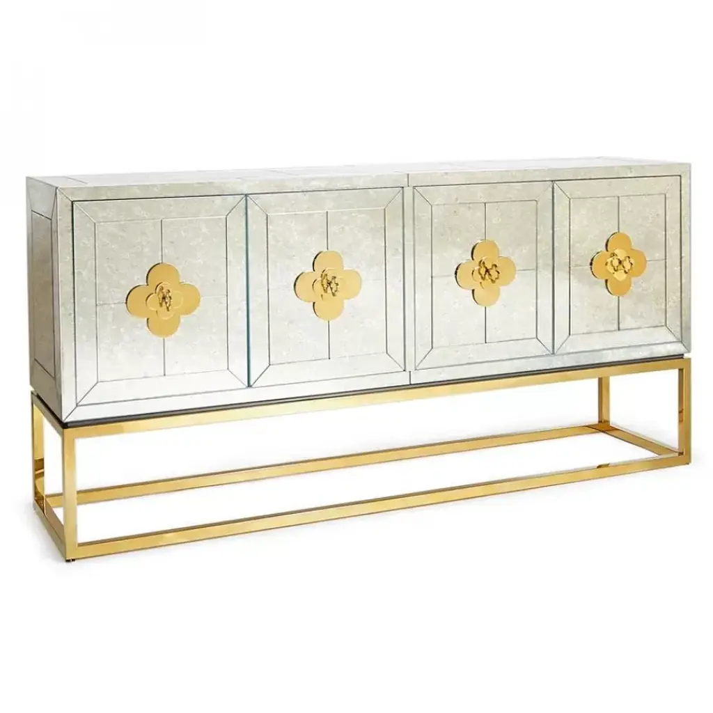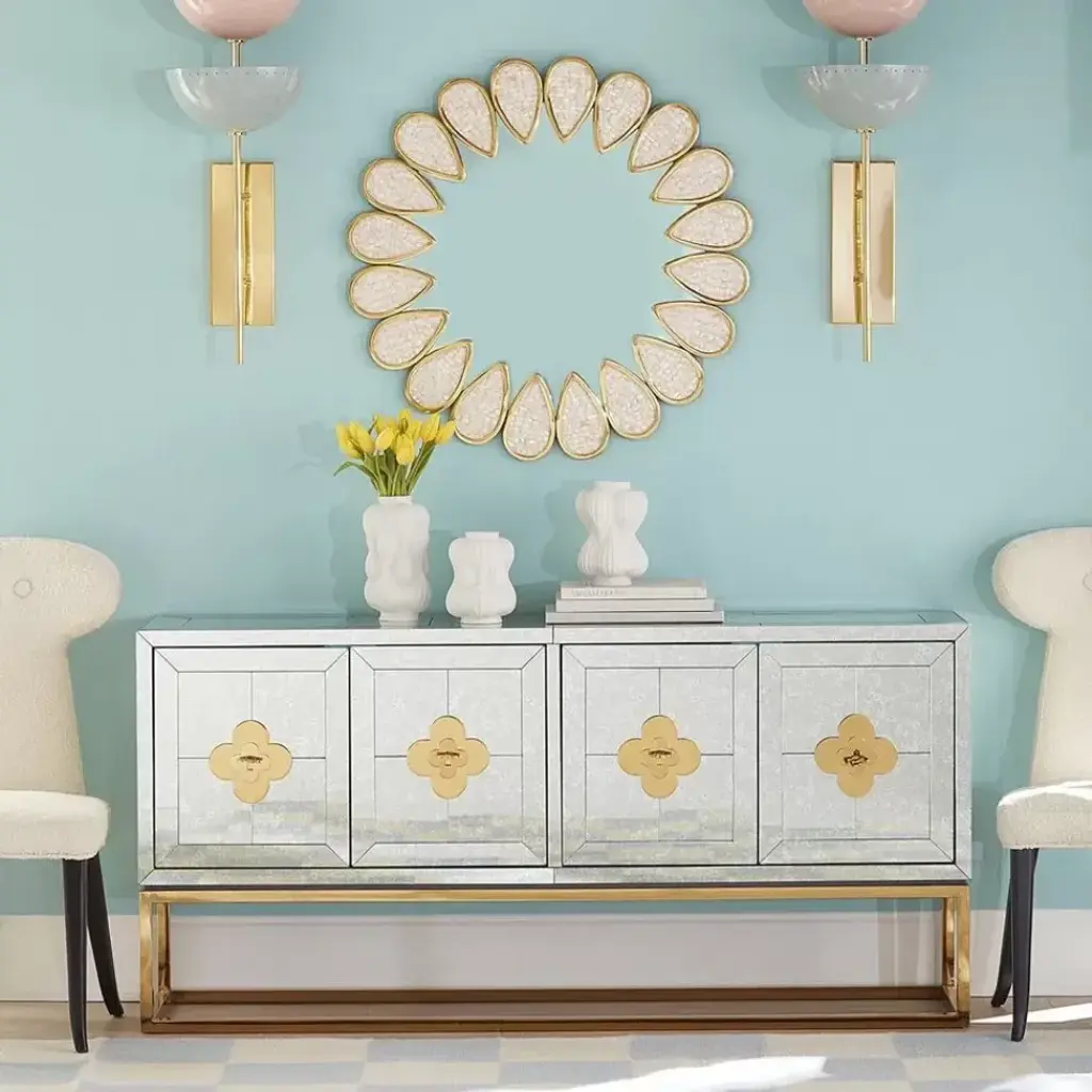 Minimalist forms meet Maximalist glamour. Antiqued mirror with a polished brass base. Two double-door compartments open to reveal a bright robin's egg blue interior fitted with two adjustable shelves. Quatrefoil handles and escutcheons add a decorative flourish to the simple form. Use our reflective Delphine Credenza as a buffet in your dining room, place it behind your sofa as a chic console, or give your foyer the gift of glamour.