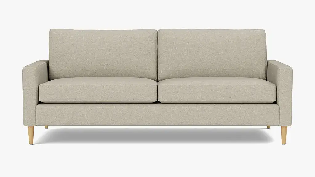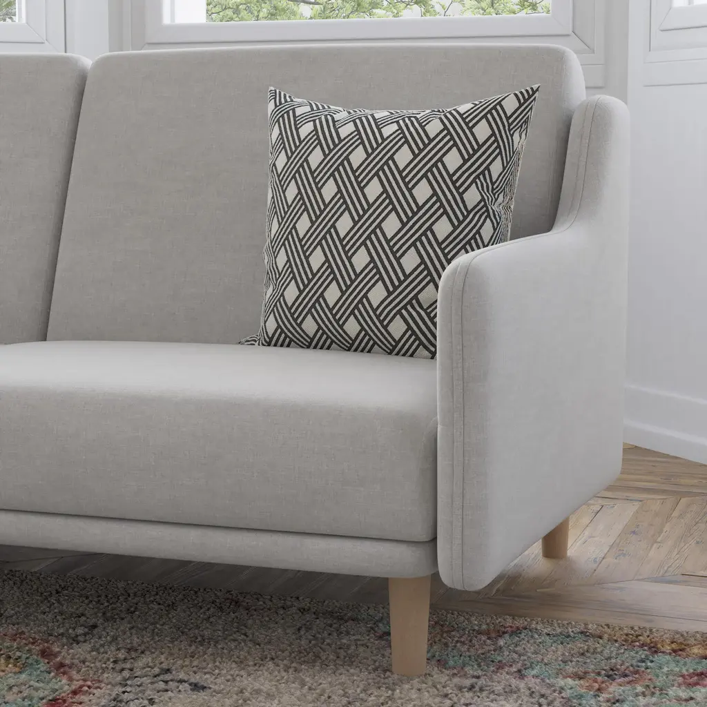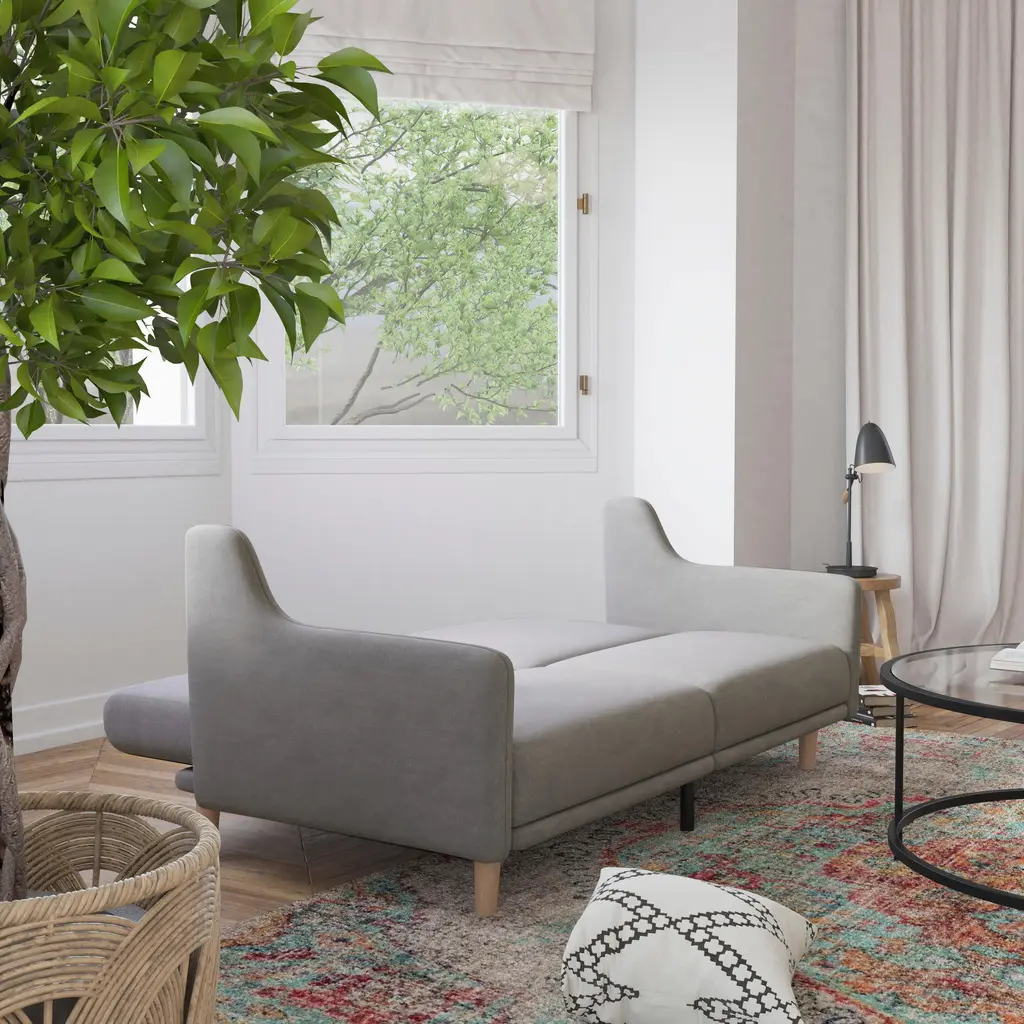 Elevate your living room, bedroom, or guest room while adding extra sleep space with this mid-century modern futon sofa. Compact and multi-functional, the split back design allows each side to be independently adjusted from upright, to reclining, and finally laying flat. If you missed the angle you wanted, simply pull the back completely forward and lay flat to start again. Generously padded and upholstered, this convertible futon sofa will cradle your body and relieve pressure points while you sit or sleep. Sturdily built with solid wood legs, a wooden frame, and center support legs, this futon sofa holds up to 600 lbs. static weight capacity. Sinuous springs in the seat give an extra supportive feel while the fixed back and seat cushions keep your space neat and tidy. Expertly packaged in 1 box, this sleeper couch arrives with the tools and illustrated instructions included for 10 minute or less assembly and cleanup is easily achieved with a damp cloth.