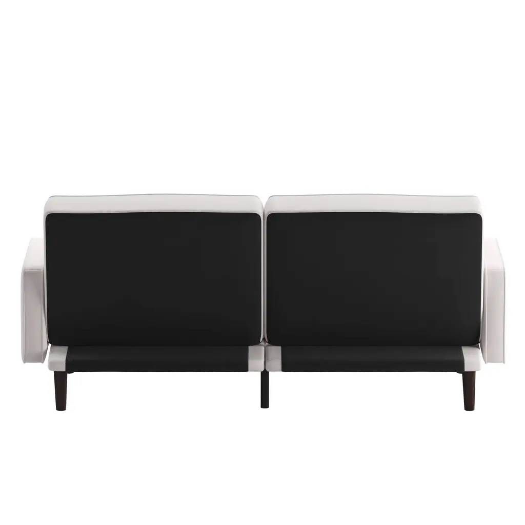 Elevate your living room, bedroom, or guest room while adding extra sleep space with this mid-century modern futon sofa. Compact and multi-functional, the split back design allows each side to be independently adjusted from upright, to reclining, and finally laying flat. If you missed the angle you wanted, simply pull the back completely forward and lay flat to start again. Generously padded and upholstered, this convertible futon sofa will cradle your body and relieve pressure points while you sit or sleep. Sturdily built with solid wood legs, a wooden frame, and center support legs, this futon sofa holds up to 600 lbs. static weight capacity. Sinuous springs in the seat give an extra supportive feel while the fixed back and seat cushions keep your space neat and tidy. Expertly packaged in 1 box, this sleeper couch arrives with the tools and illustrated instructions included for 10 minute or less assembly and cleanup is easily achieved with a damp cloth.