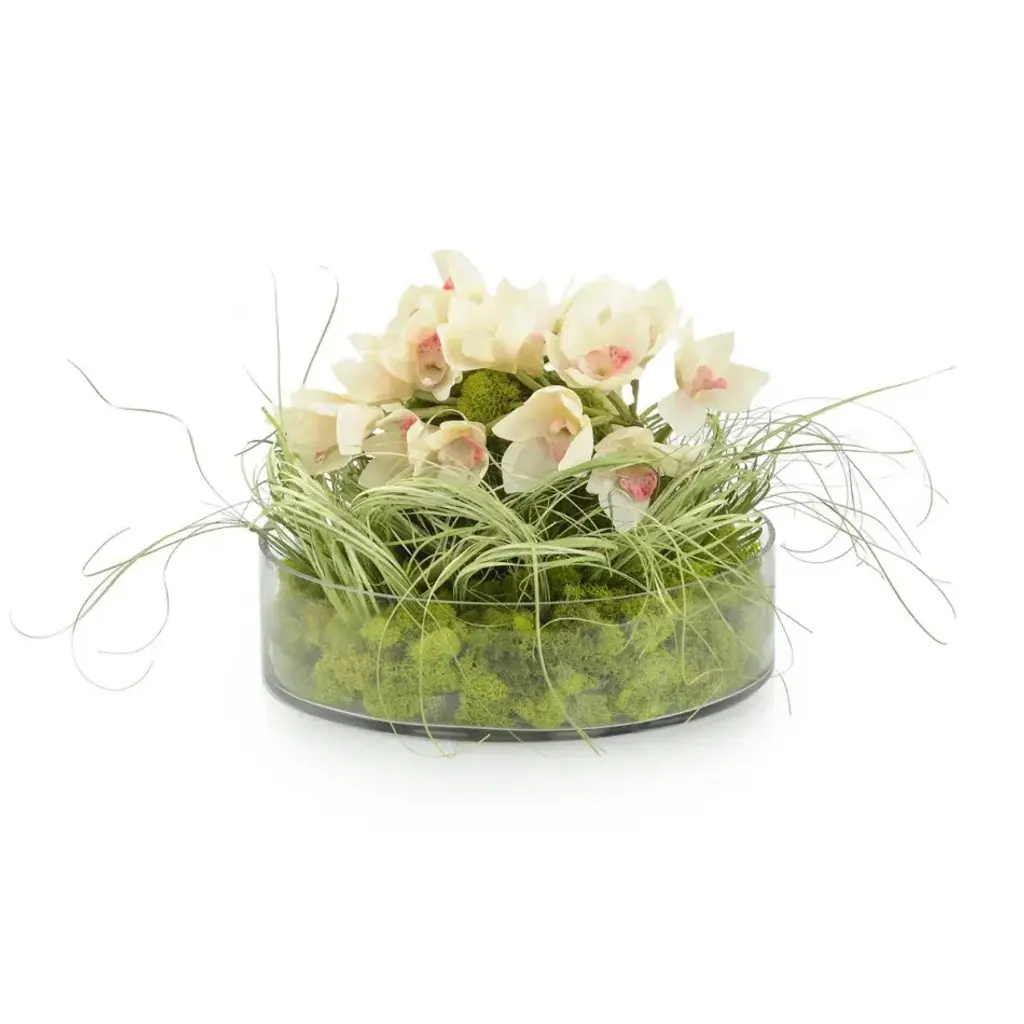 Long & slender natural grass blades with white real feel delphiniums and succulents on a bed of preserved natural mood moss in a gold vessel.