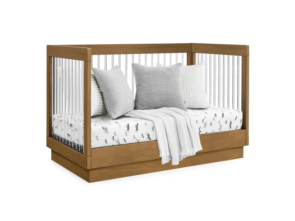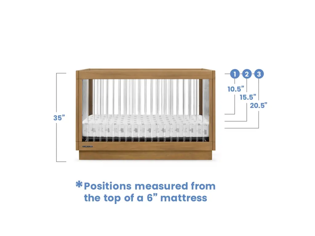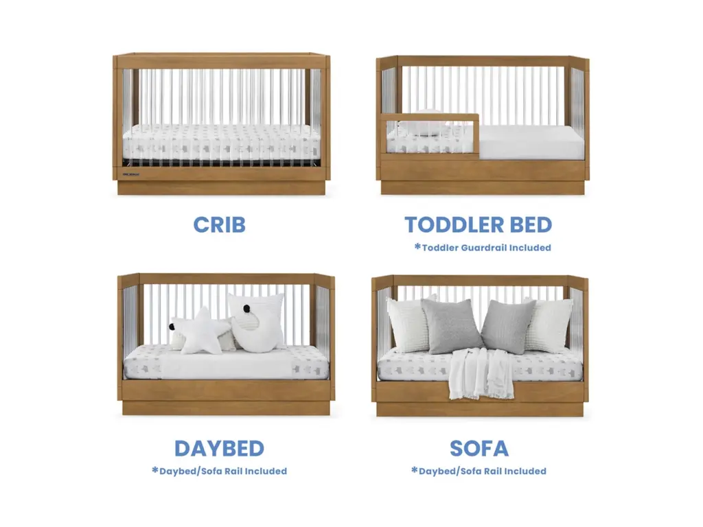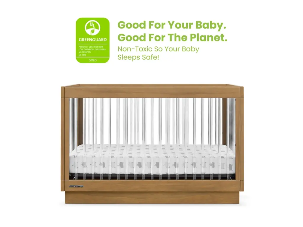 Clearly, you can see why the James Acrylic 4-in-1 Convertible Crib by Delta Children is the only choice for your baby's nursery. Recyclable and non-toxic clear acrylic spindles around all four sides create an open and airy look while also providing the best view of your baby. To finish the look, the Acorn-colored stained base and painted frame, made from sustainable New Zealand pine wood, provide the perfect contrast. A one-of-a-kind design for your baby's stylish bedroom, the crib's adjustable mattress support allows you to lower the mattress height as your baby grows. Modern and functional, this crib includes all needed conversion rails which allows you to seamlessly convert from crib to toddler bed, daybed or sofa. Plus, it's GREENGUARD Gold Certified, which means it's built to contribute to cleaner air for a healthy home. Available in Bianca White with Acorn and Midnight Gray with Acorn. Easily mix, match, and layer with other items from Delta Children.