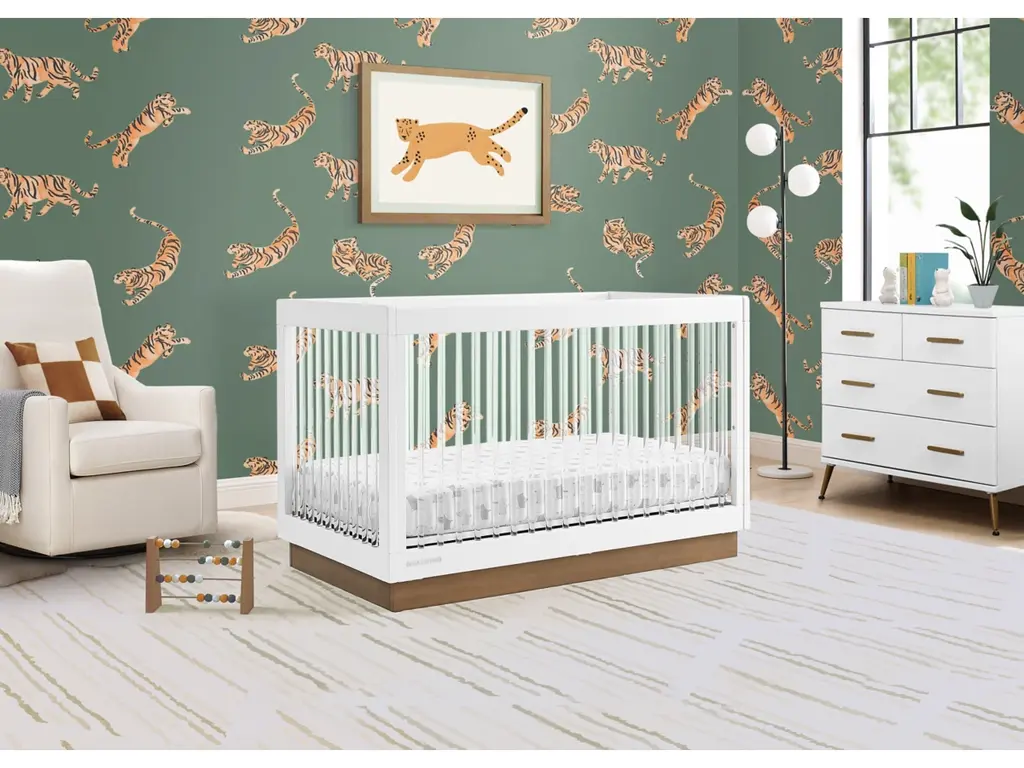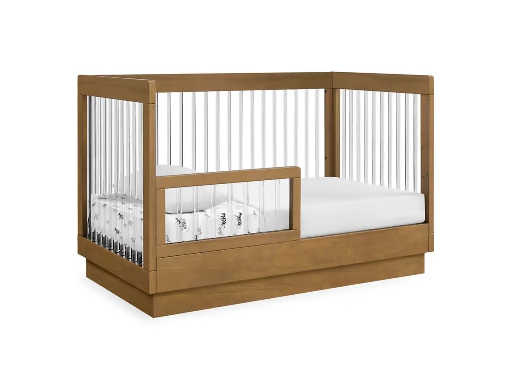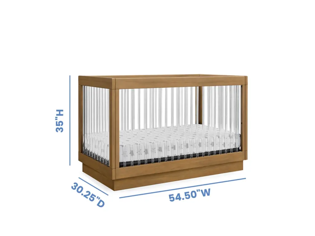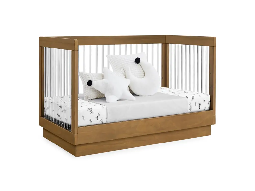 Clearly, you can see why the James Acrylic 4-in-1 Convertible Crib by Delta Children is the only choice for your baby's nursery. Recyclable and non-toxic clear acrylic spindles around all four sides create an open and airy look while also providing the best view of your baby. To finish the look, the Acorn-colored stained base and painted frame, made from sustainable New Zealand pine wood, provide the perfect contrast. A one-of-a-kind design for your baby's stylish bedroom, the crib's adjustable mattress support allows you to lower the mattress height as your baby grows. Modern and functional, this crib includes all needed conversion rails which allows you to seamlessly convert from crib to toddler bed, daybed or sofa. Plus, it's GREENGUARD Gold Certified, which means it's built to contribute to cleaner air for a healthy home. Available in Bianca White with Acorn and Midnight Gray with Acorn. Easily mix, match, and layer with other items from Delta Children.