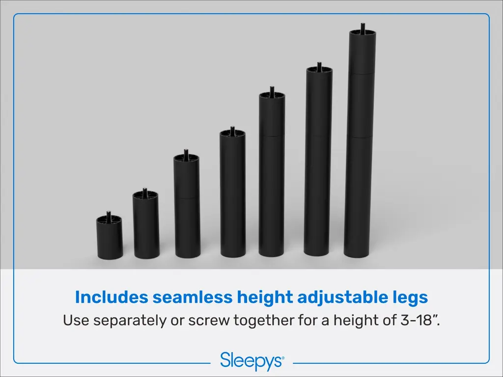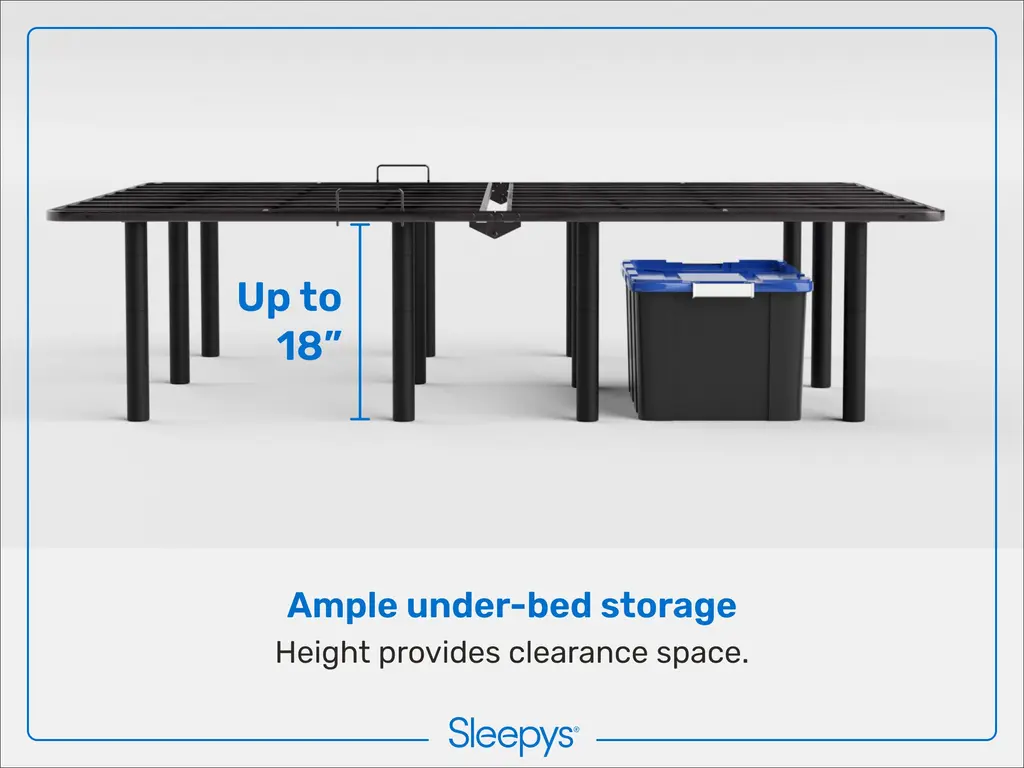 With the Sleepy's Deluxe Platform Frame, you'll get the mattress support you want and the ample under-bed storage you need. Made with 100% durable steel, it supports up to 4,000 lbs—plus, retainer bars and non-slip tape secure the mattress in place for a sturdy, peaceful night's sleep. Use the seamless height adjustable legs separately or screw together for a height of 3-18”. Assembly is effortless—no tools are required. Plus, rest easy: Not only is this frame built to last, you get a 5-year limited warranty to make sure.