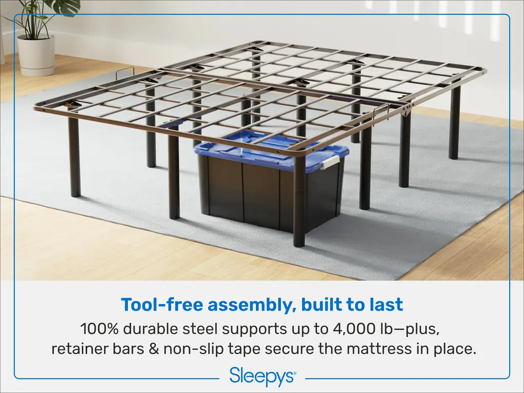 With the Sleepy's Deluxe Platform Frame, you'll get the mattress support you want and the ample under-bed storage you need. Made with 100% durable steel, it supports up to 4,000 lbs—plus, retainer bars and non-slip tape secure the mattress in place for a sturdy, peaceful night's sleep. Use the seamless height adjustable legs separately or screw together for a height of 3-18”. Assembly is effortless—no tools are required. Plus, rest easy: Not only is this frame built to last, you get a 5-year limited warranty to make sure.