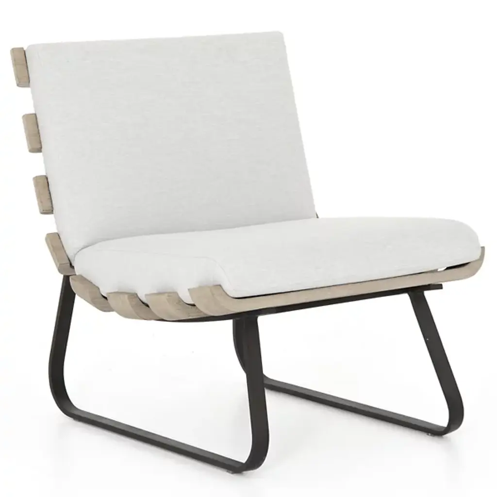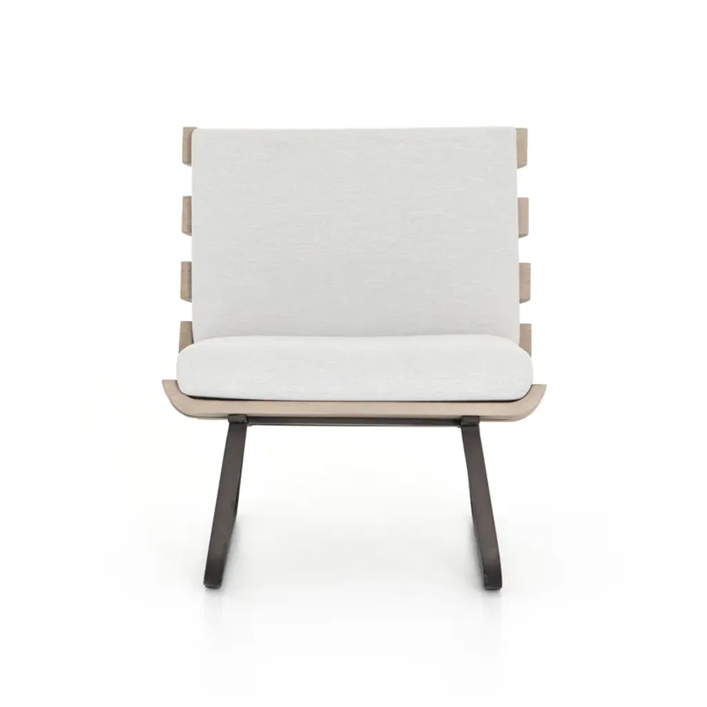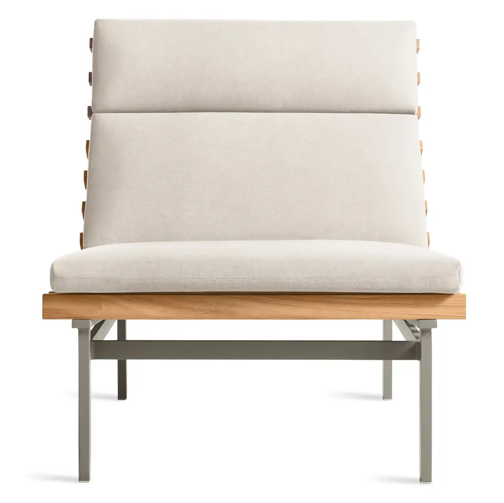 The Demi lounge chair takes modern comfort to the next level. Its bronze aluminum base supports a slatted, FSC-certified teak frame, finished in washed brown. Plush grey cushioning is upholstered in UV-resistant, water-repellent olefin performance fabric, ensuring durability outdoors.