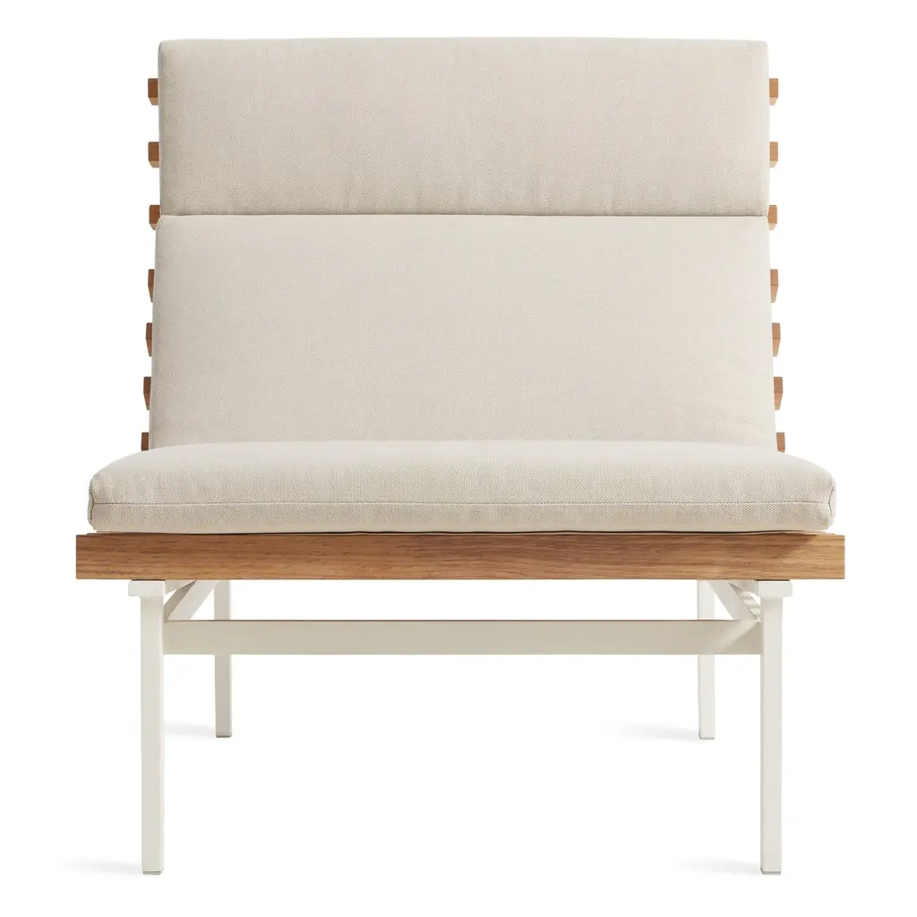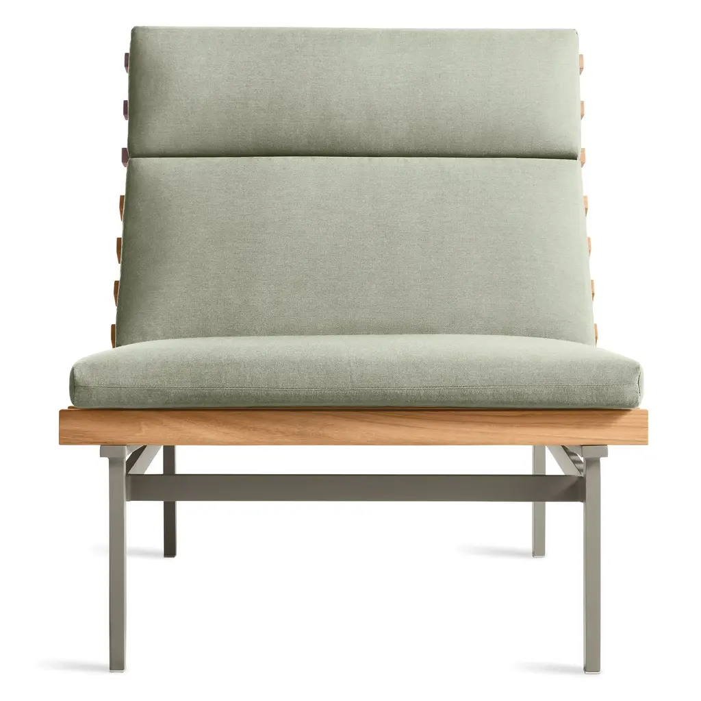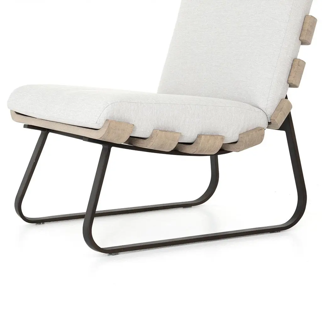 The Demi lounge chair takes modern comfort to the next level. Its bronze aluminum base supports a slatted, FSC-certified teak frame, finished in washed brown. Plush grey cushioning is upholstered in UV-resistant, water-repellent olefin performance fabric, ensuring durability outdoors.