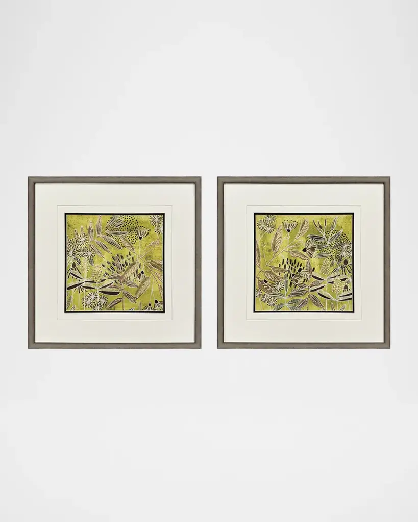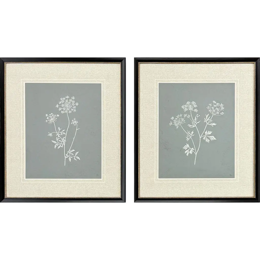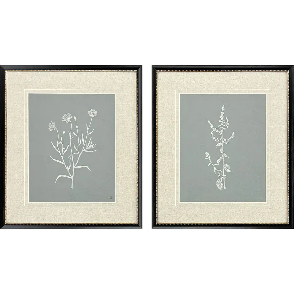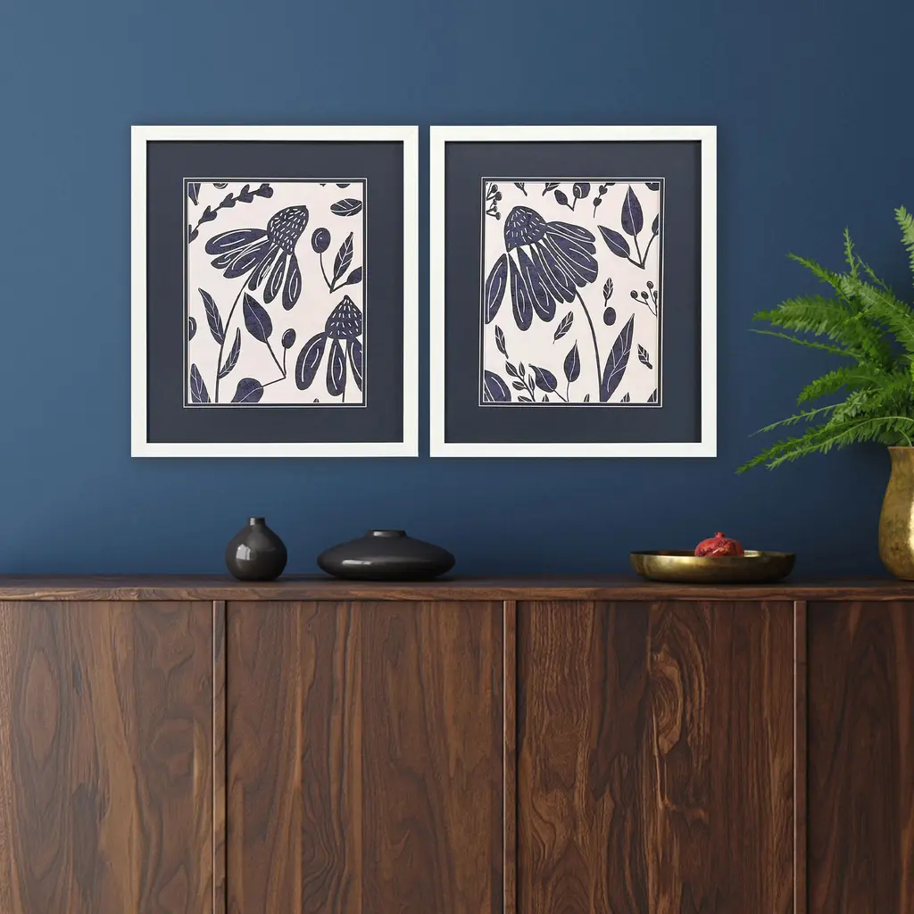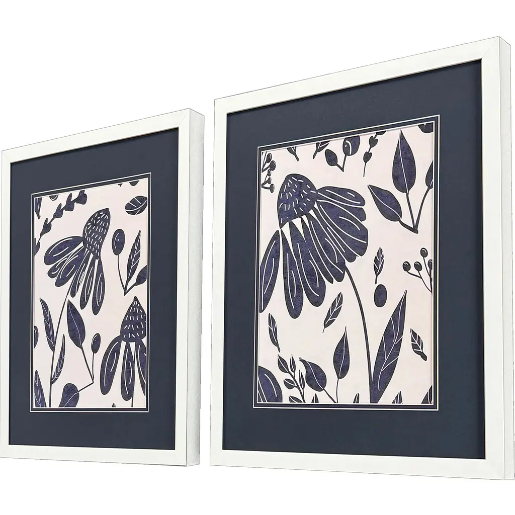 Primitive styled blue botanicals are double matted in navy blue. Framed in a modern flat profile molding with a matte white finish.