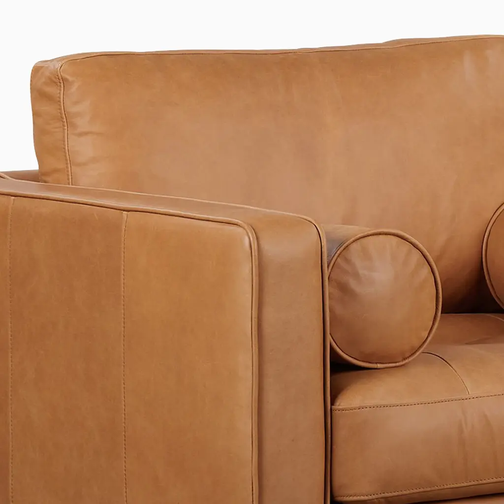 Lounge-ready leather set completes any living room. We took a classic shape and added retro details. Wood frame is kiln-dried for extra durability. Tufted seat cushion adds plush texture.
