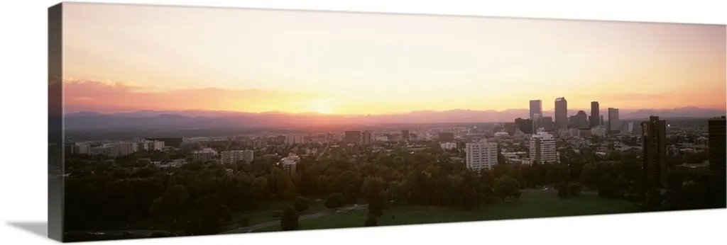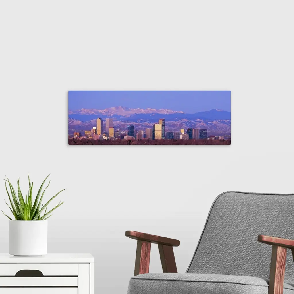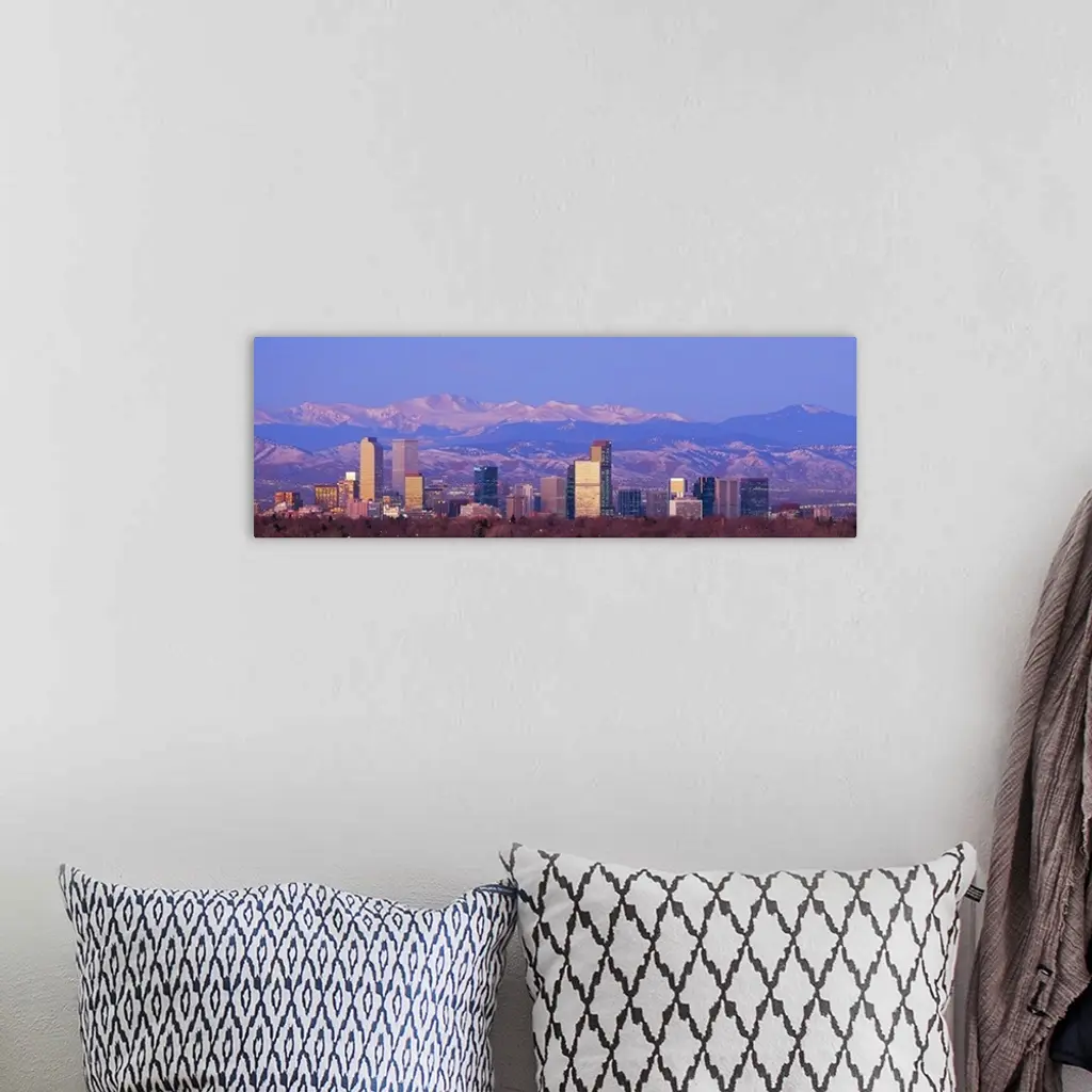 Panoramic view of the Rocky Mountains and downtown skyline of the Mile High City, Colorado in the early morning.