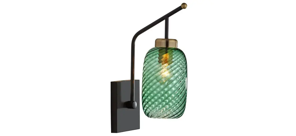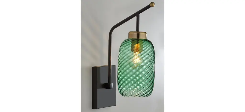 Expertly pairing and antique accents with unique hand blown textured swirled glass, the Derrick Wall Lamp elevates any space with its bold color palette and artful detailing. A rich glass shade pairs beautifully with colorful fabrics and bring a popular and restful hue to brighten up a kitchen, living room, bathroom, or bedroom. For symmetrical design, pair two of these sconces on either side of beds, fireplaces, or mirrors or place individually in entryways or other spaces for a pop of light. This sconce mounts to your wall with a rectangular metal base, while a thin matching arm with antique accents extends from the base. Attached to the arm is a stunning cylindrical glass shade. Its bold color beautifully highlights the swirling texture of the shade, while the glass leaves the 40W bulb visible, making a vintage Edison bulb (sold separately) a striking choice.