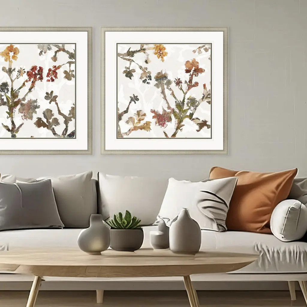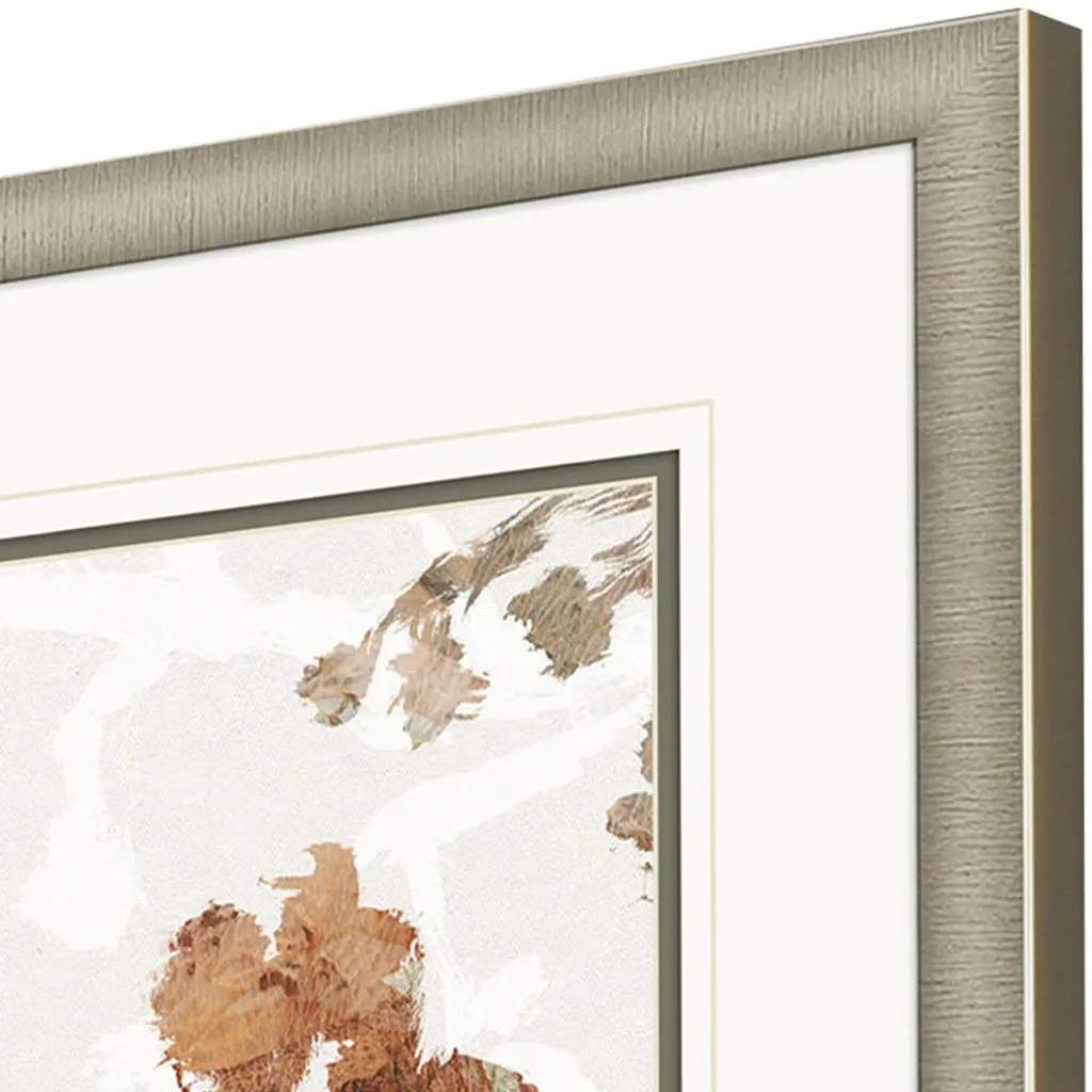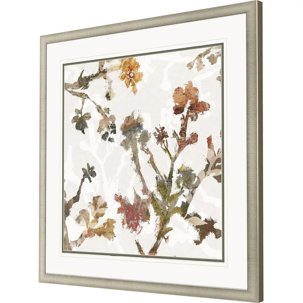 Rustic blooms are arranged in a casual display. Matted in white and moss. Framed in a champagne gold block contemporary moulding.