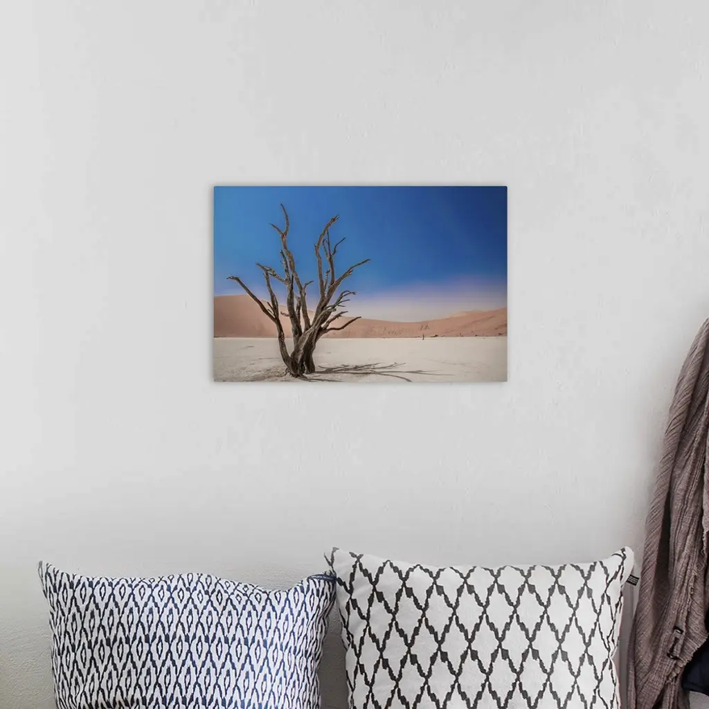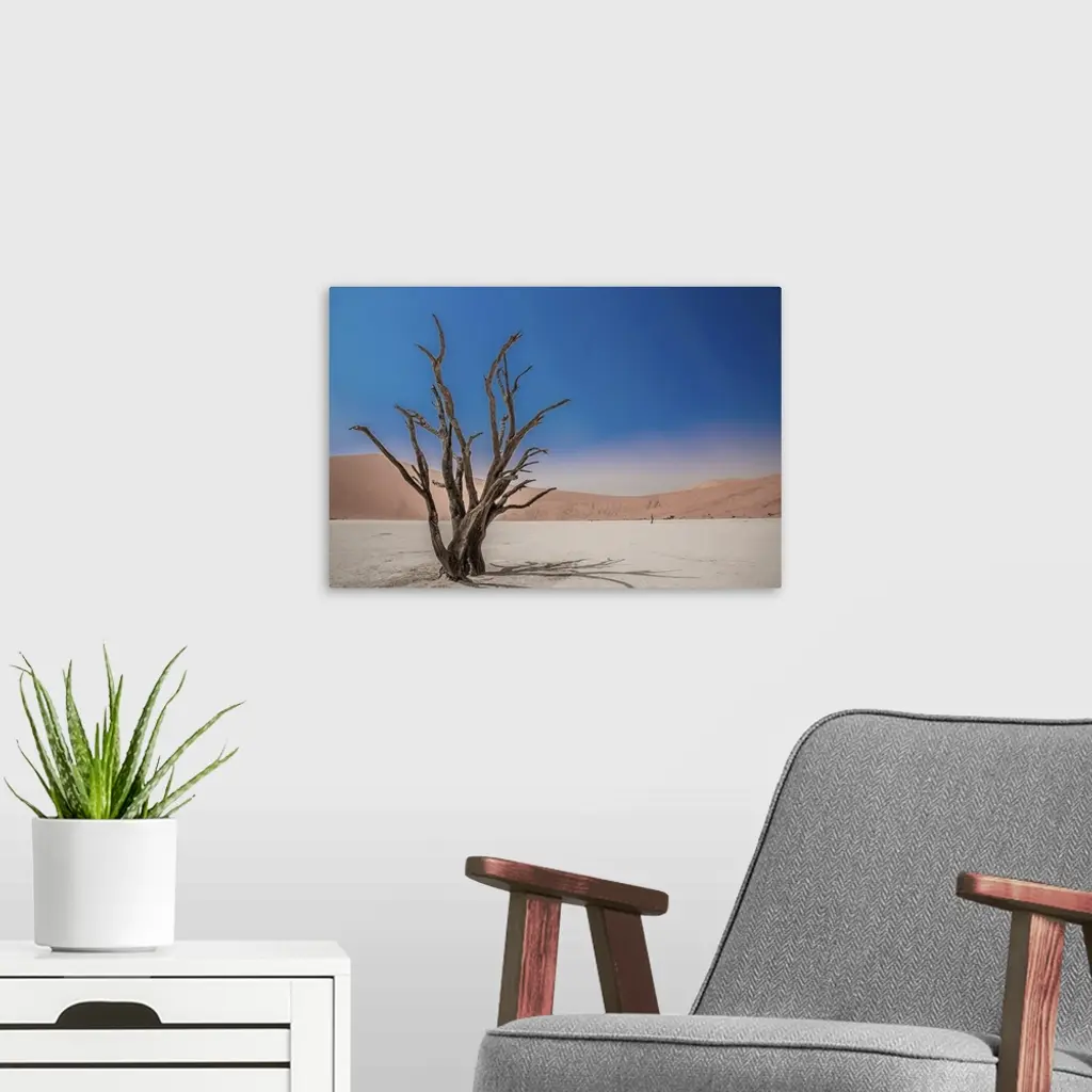 Deadvlei in the Namib desert of Namibia is a dry landscape surrounded by high dunes, the cracked earth is broken by dead camel thorn trees that cannot decay because of the lack of water.