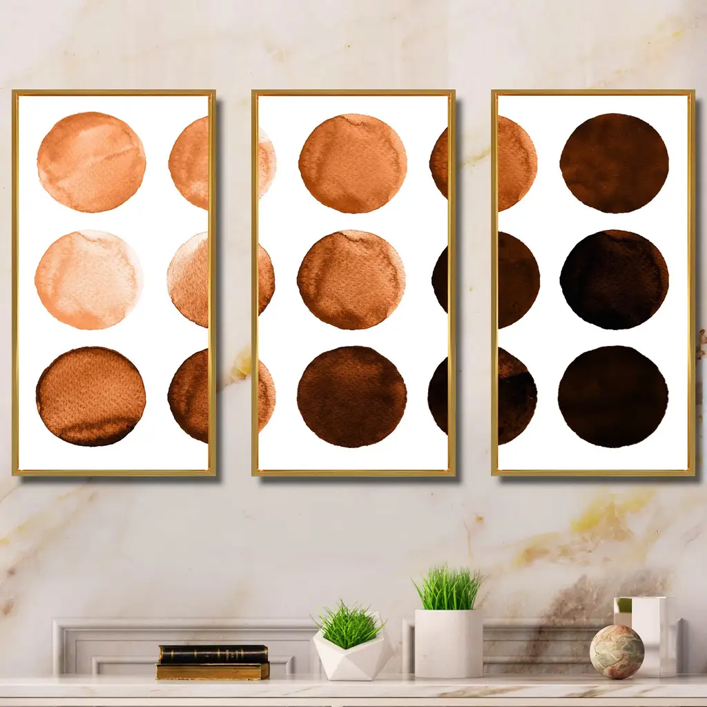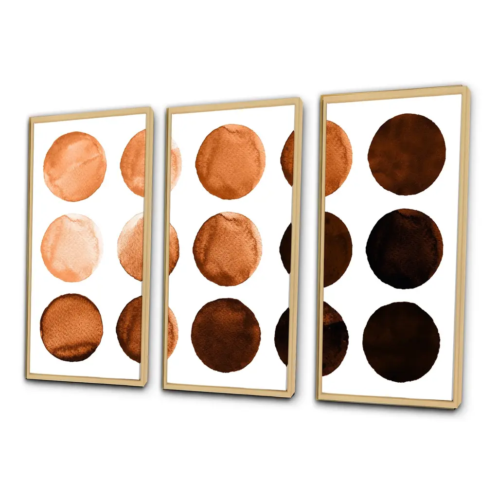 This beautiful Nine Circles In Shades Of Orange And Brown I 3 Panels Framed Canvas Art is printed using the highest quality fade-resistant ink on canvas. Every one of our fine art giclee canvas prints is printed on premium quality canvas, using the finest quality inks which will not fade over time. Each giclee print is stretched tightly over a 1-inch wood sub frame ensuring the canvas is taught and does not buckle. The canvas print is inserted into a wood floating frame. All of our Framed canvas prints are carefully packaged with corner protection, fragile labeling and sturdy boxes to ensure safe delivery. Every framed canvas print arrives ready to hang on the wall, with the hanging kits included. This framed art print is available in many different color frames. Features: - Style : Modern & Contemporary - Subject : Geometric, - Color : Brown - Premium quality cotton canvas. - Arrives ready to hang on the wall - Easy to Hang