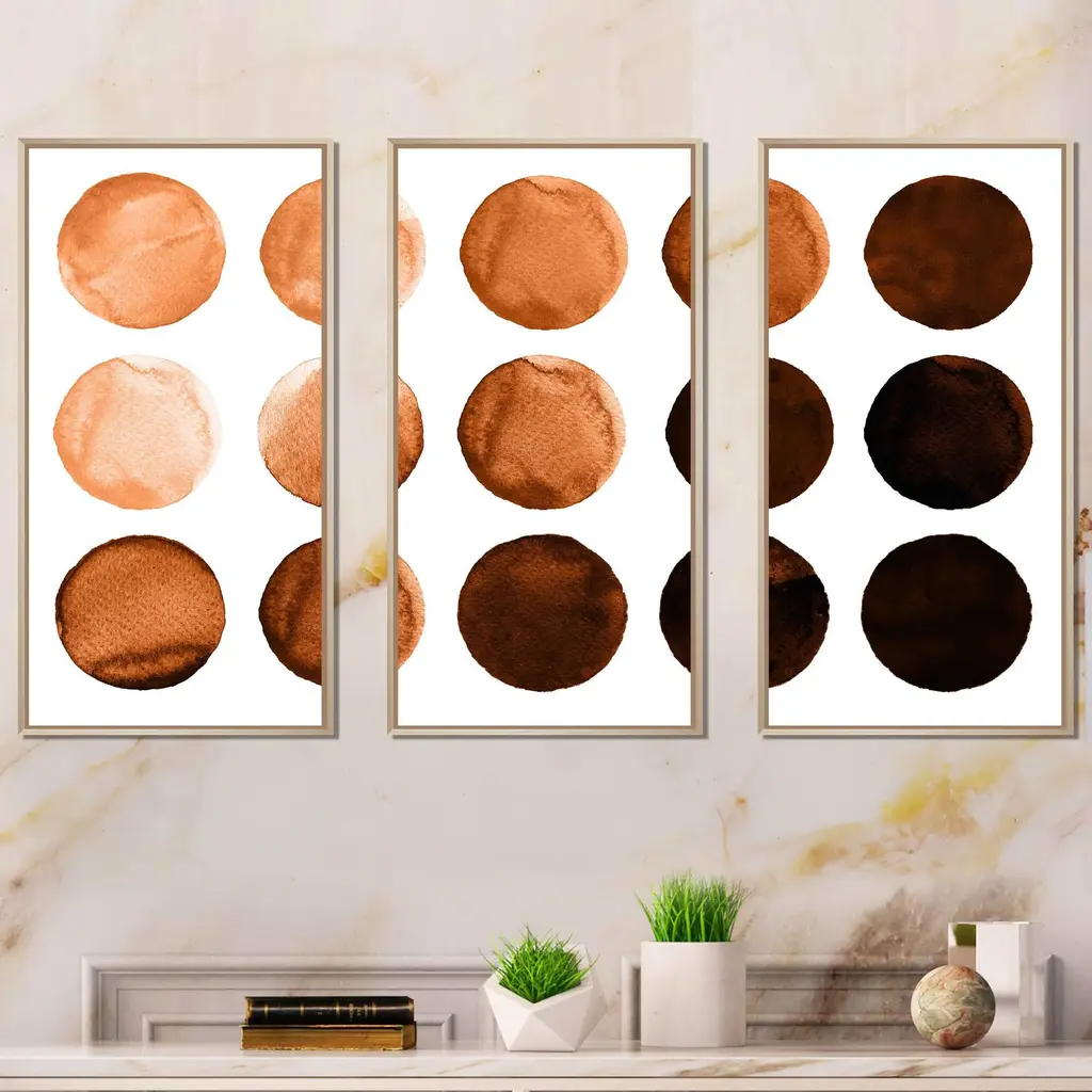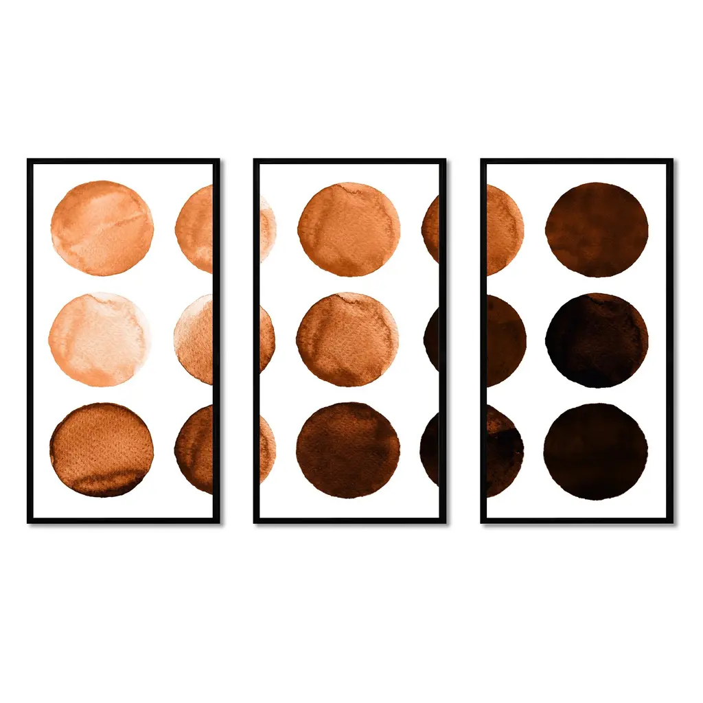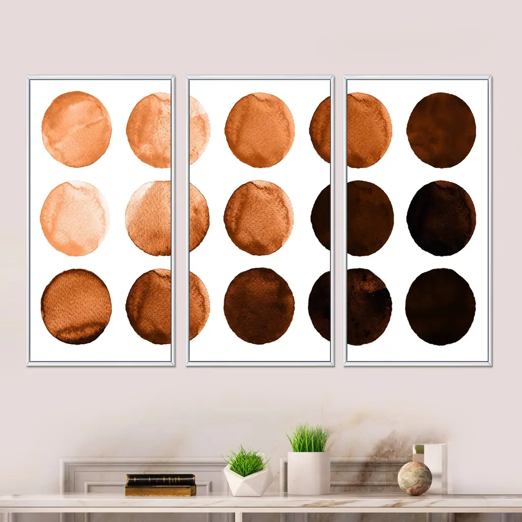 This beautiful Nine Circles In Shades Of Orange And Brown I 3 Panels Framed Canvas Art is printed using the highest quality fade-resistant ink on canvas. Every one of our fine art giclee canvas prints is printed on premium quality canvas, using the finest quality inks which will not fade over time. Each giclee print is stretched tightly over a 1-inch wood sub frame ensuring the canvas is taught and does not buckle. The canvas print is inserted into a wood floating frame. All of our Framed canvas prints are carefully packaged with corner protection, fragile labeling and sturdy boxes to ensure safe delivery. Every framed canvas print arrives ready to hang on the wall, with the hanging kits included. This framed art print is available in many different color frames. Features: - Style : Modern & Contemporary - Subject : Geometric, - Color : Brown - Premium quality cotton canvas. - Arrives ready to hang on the wall - Easy to Hang