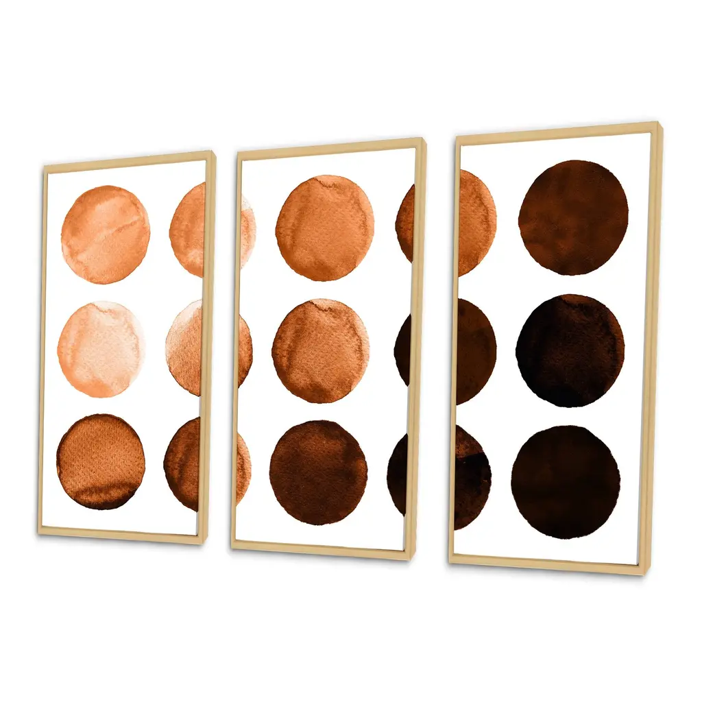 This beautiful Nine Circles In Shades Of Orange And Brown I 3 Panels Framed Canvas Art is printed using the highest quality fade-resistant ink on canvas. Every one of our fine art giclee canvas prints is printed on premium quality canvas, using the finest quality inks which will not fade over time. Each giclee print is stretched tightly over a 1-inch wood sub frame ensuring the canvas is taught and does not buckle. The canvas print is inserted into a wood floating frame. All of our Framed canvas prints are carefully packaged with corner protection, fragile labeling and sturdy boxes to ensure safe delivery. Every framed canvas print arrives ready to hang on the wall, with the hanging kits included. This framed art print is available in many different color frames. Features: - Style : Modern & Contemporary - Subject : Geometric, - Color : Brown - Premium quality cotton canvas. - Arrives ready to hang on the wall - Easy to Hang