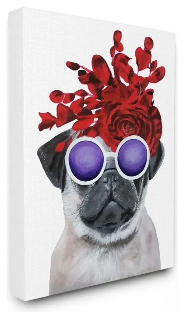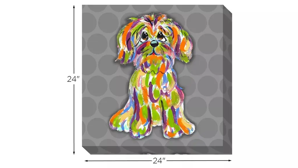Designer decor doesn't get much cuter than this! Broad, colorful strokes and a chic gray polka-dotted background make this puppy-themed piece a perfect choice for dog lovers and contemporary decorators alike.