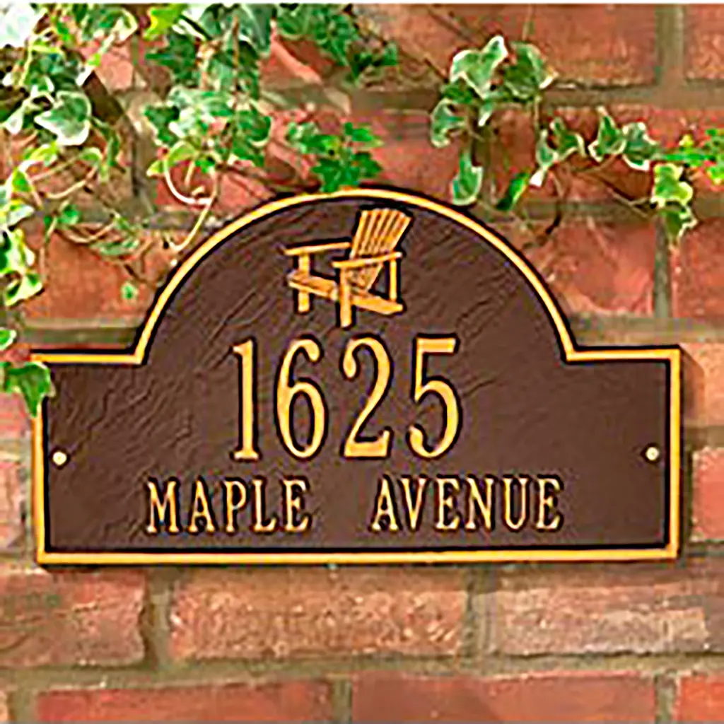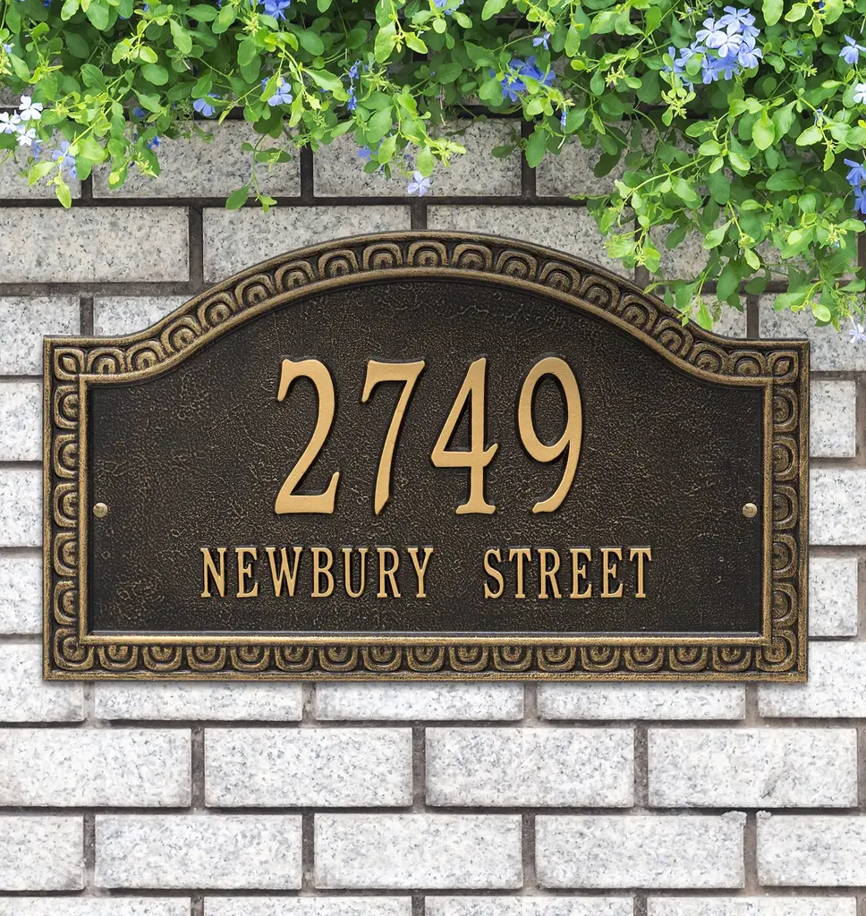 Create a Designer Address Plaque that pairs perfectly with your home's exterior. Customize this plaque with your choice of three finishes, two sizes, seven icons, and one or two lines of personalized text. Non-corroding aluminum with a protective powdercoat. Frontgate exclusive Powdercoating withstands rain, snow and UV rays without fading Standard: One-line version holds up to five 4" numbers; Two-line version holds up to five 3" numbers on the first line and eleven 1-1/4" characters on the second lineEstate: One-line version holds up to five 5-1/2" numbers; Two-line version holds up to five 4" numbers on the first line and eleven 1-3/4" characters on the second line To clean, use a non-abrasive detergent and water with a soft cloth, sponge or brush Wall plaques include four 1" solid-brass wood screws Please check for accuracy; personalized orders cannot be modified, cancelled, or returned after being placed Made in USA Personalized items are nonreturnable. At Frontgate, our primary focus is quality. We guarantee that every product we sell will stand up to the supreme test – our customers' satisfaction. To learn more about our policies, visit our Shipping & Processing, Returns & Exchanges and Warranty & Price Guarantee pages.