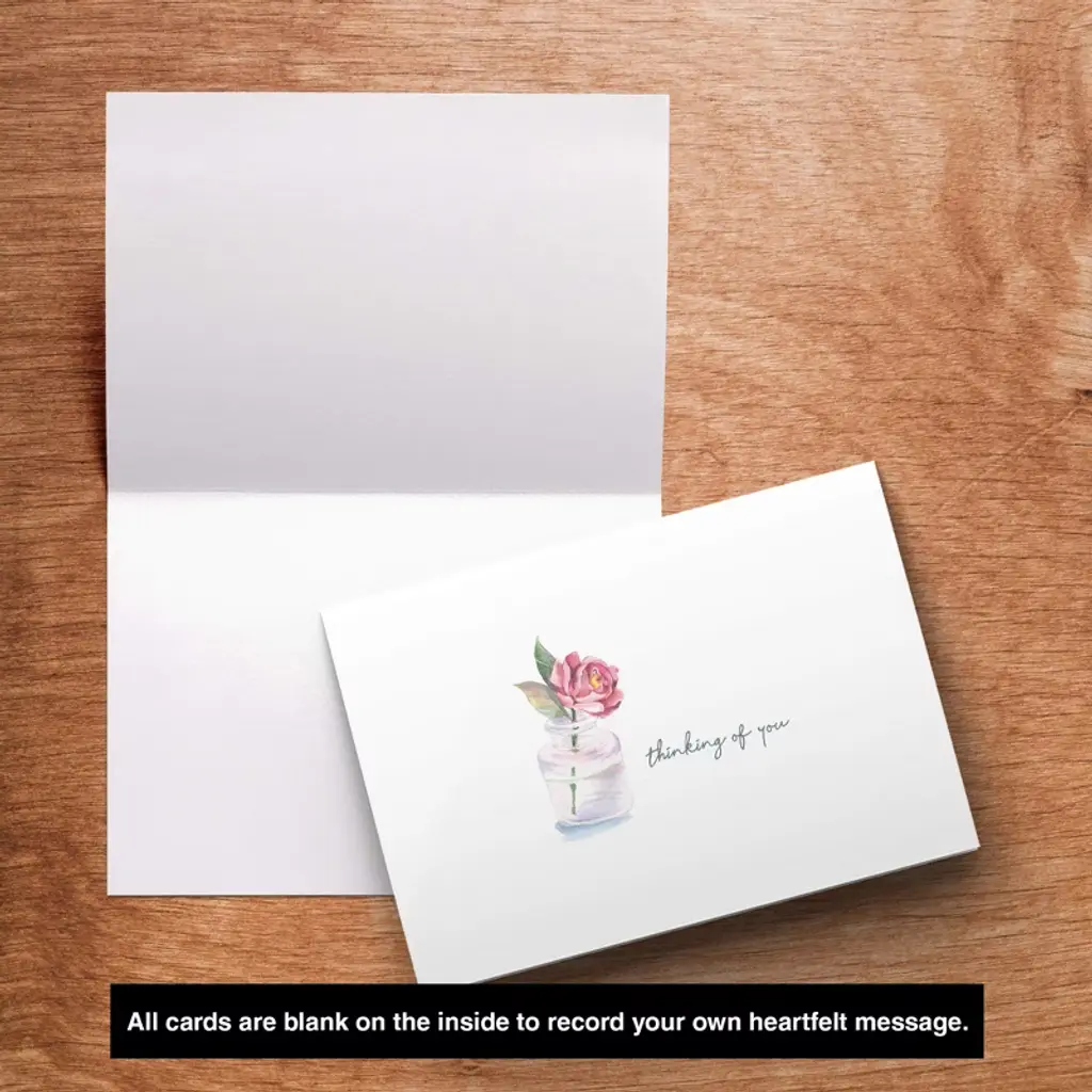 Small but blank inside these floral thinking of you cards by Dessie allow you the freedom to share heartwarming sentiments with friends coworkers loved ones neighbors and more. Both sophisticated and understated the simple but beautiful minimalist designs make these greeting cards suitable for a variety of occasions. Send the 4x6 white cards to offer solace during times of loss to impart gratitude to express appreciation or to let that special someone far away know you’ve been missing them. They’re cute they’re cheerful and they’re sure to make their recipients smile at the thought of knowing you care.