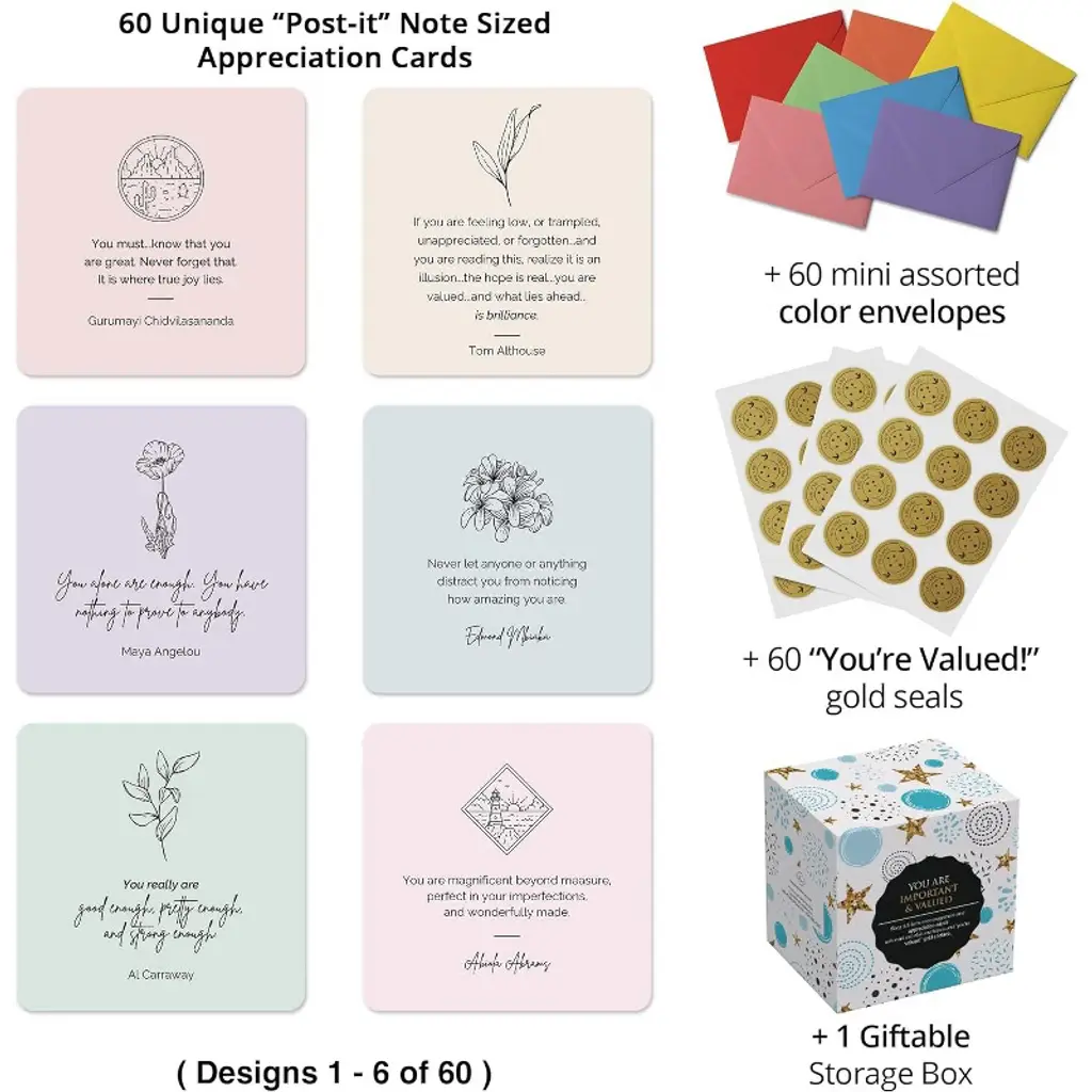 Raise a friend or coworkers spirits with You Are Important Valued inspirational mini cards by Dessie. These motivational cards feature words of encouragement and congratulations on one side of the card while the other says You are important and valued. Write a short heartfelt message in the blank space underneath this inspiring message. Each card features unique designs and patterns. The mini size fits perfectly in a pocket and lets you give out these positive affirmation cards for adults easily at work or gatherings. Inspirational quotes from people like Sophie Turner Aberjhani and others will encourage your loved ones. Our set of inspirational pocket cards comes with 60 mini cards 60 colorful envelopes and gold sealing stickers with You are valued on them. Store everything in the included box.