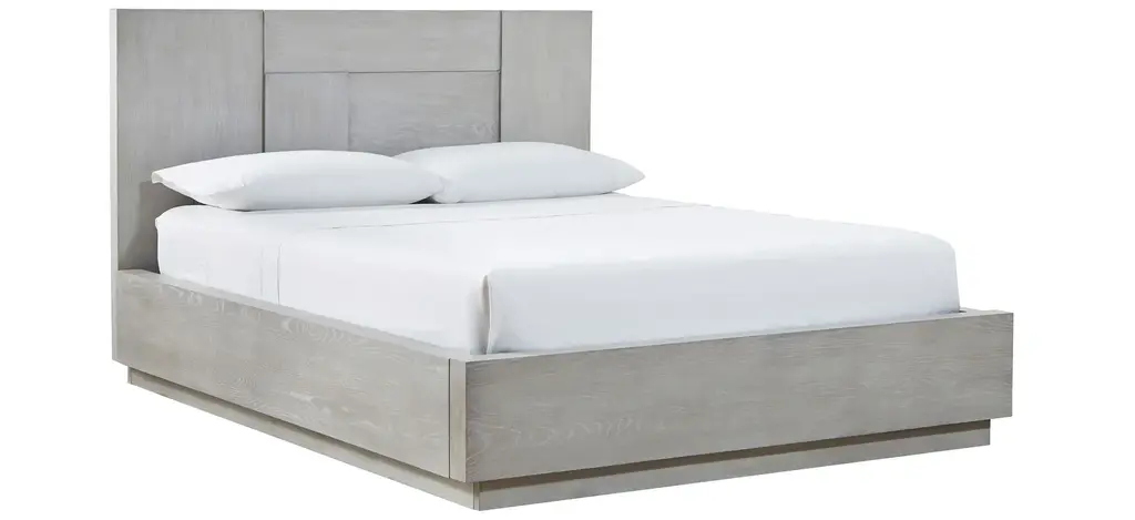 Made of solid Meranti wood and Ash veneer, the Destination Full Panel Bed is treated with a natural Cotton Grey stain to show off the fine knot and grain characteristics inherent in the timber. Clean drawer faces are accented with center-mounted nickel-plated drawer pulls while each piece sits atop a plinth base for uncompromised stability.