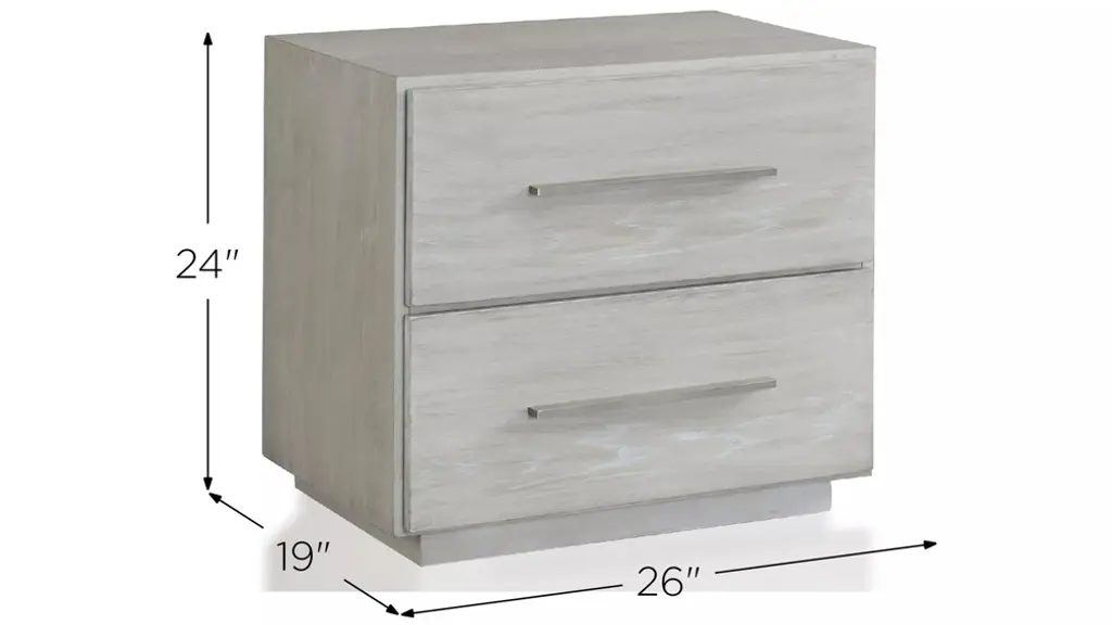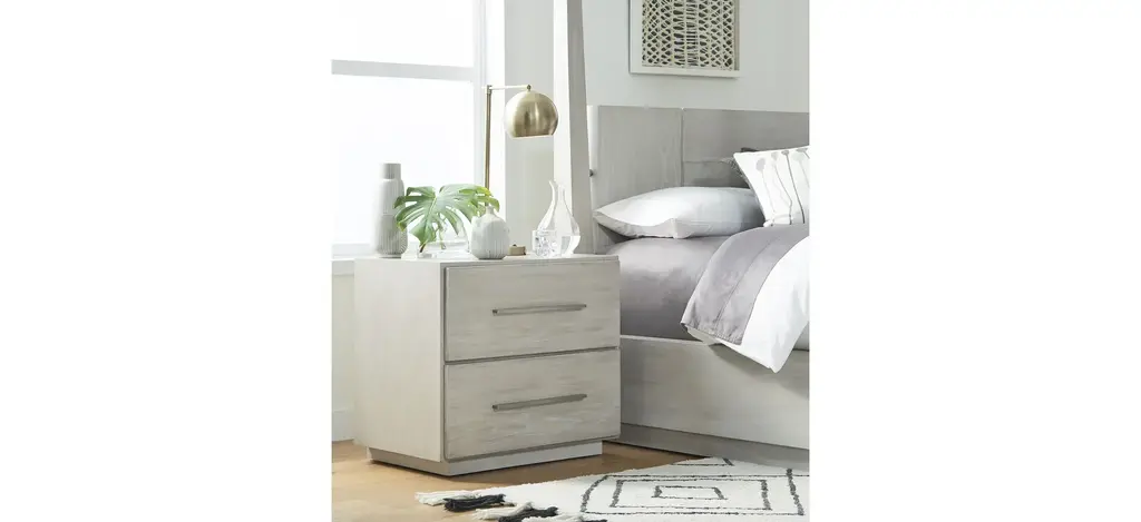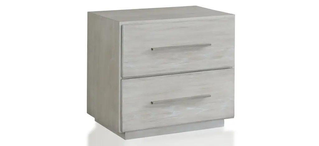 Made of solid Meranti wood and Ash veneer, each piece in the Destination Nightstand is treated with a natural Cotton Grey stain to show off the fine knot and grain characteristics inherent in the timber. Clean drawer faces are accented with center-mounted nickel-plated drawer pulls while each piece sits atop a plinth base for uncompromised stability.