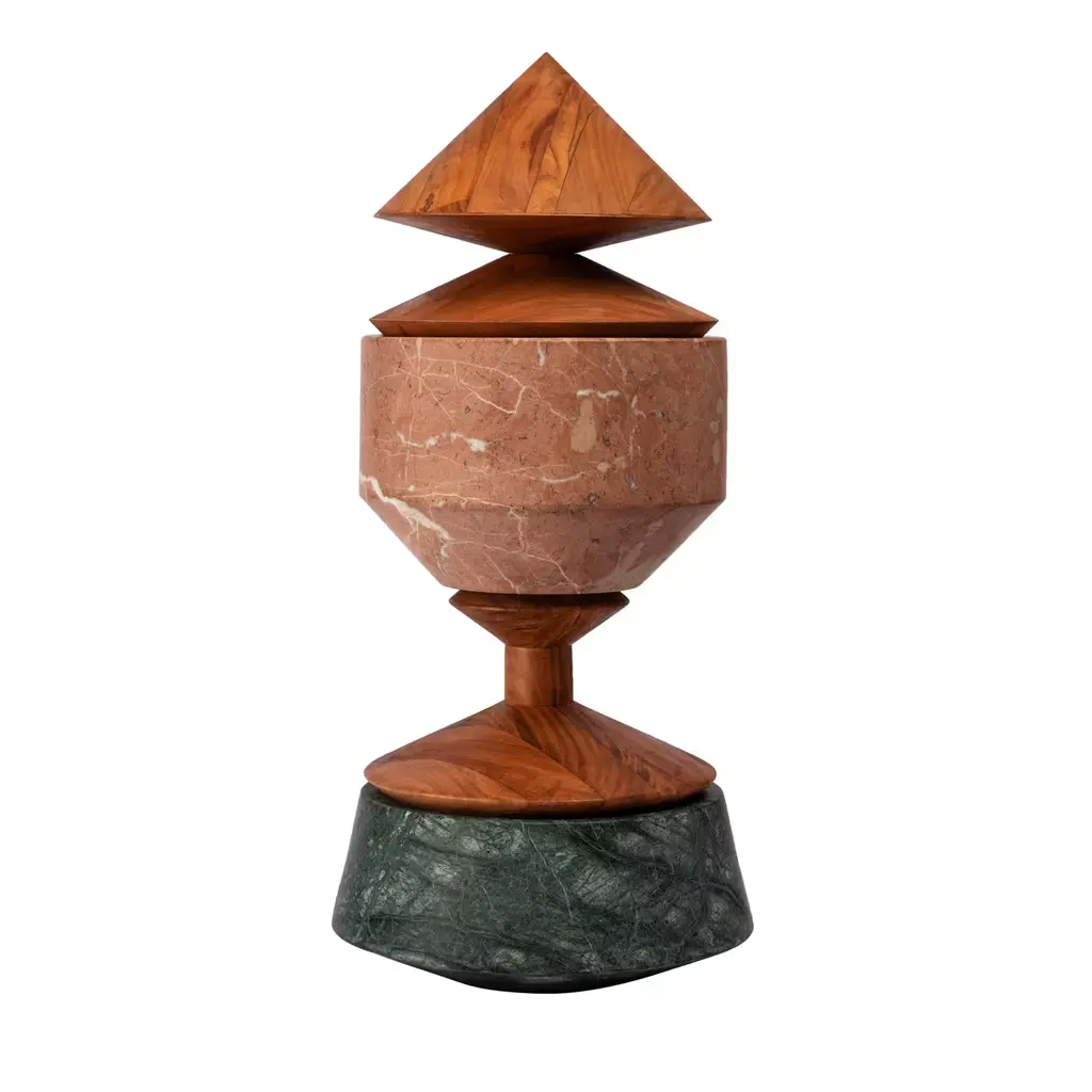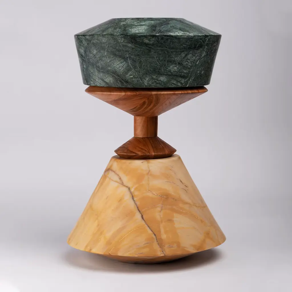 Crossed Paths is a collection of stunning and original objects made of Trani Biancone, Alicante Red, Guatemala Green, Siena Yellow and Emperador marble varieties with elements of cherry wood. Two companies in the Neapolitan area focusing on production excellence, the search for materials, unique and refined workmanship and infinite solutions obtained through their crossed paths.