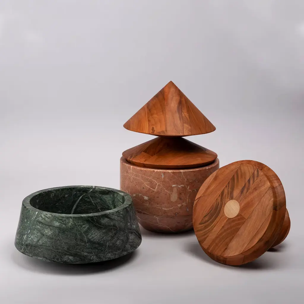A collection of stunning and highly original objects crafted in Trani Biancone, Alicante Red, Guatemala Green, Siena Yellow and Emperador marble varieties, with elements of cherry wood. This piece of art brings a unique character to any decor. Two companies in the Neapolitan area created the range, focusing on production excellence, quality materials and refined workmanship.
