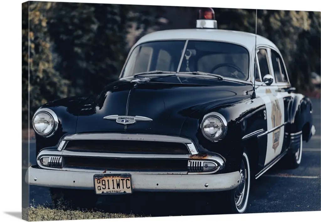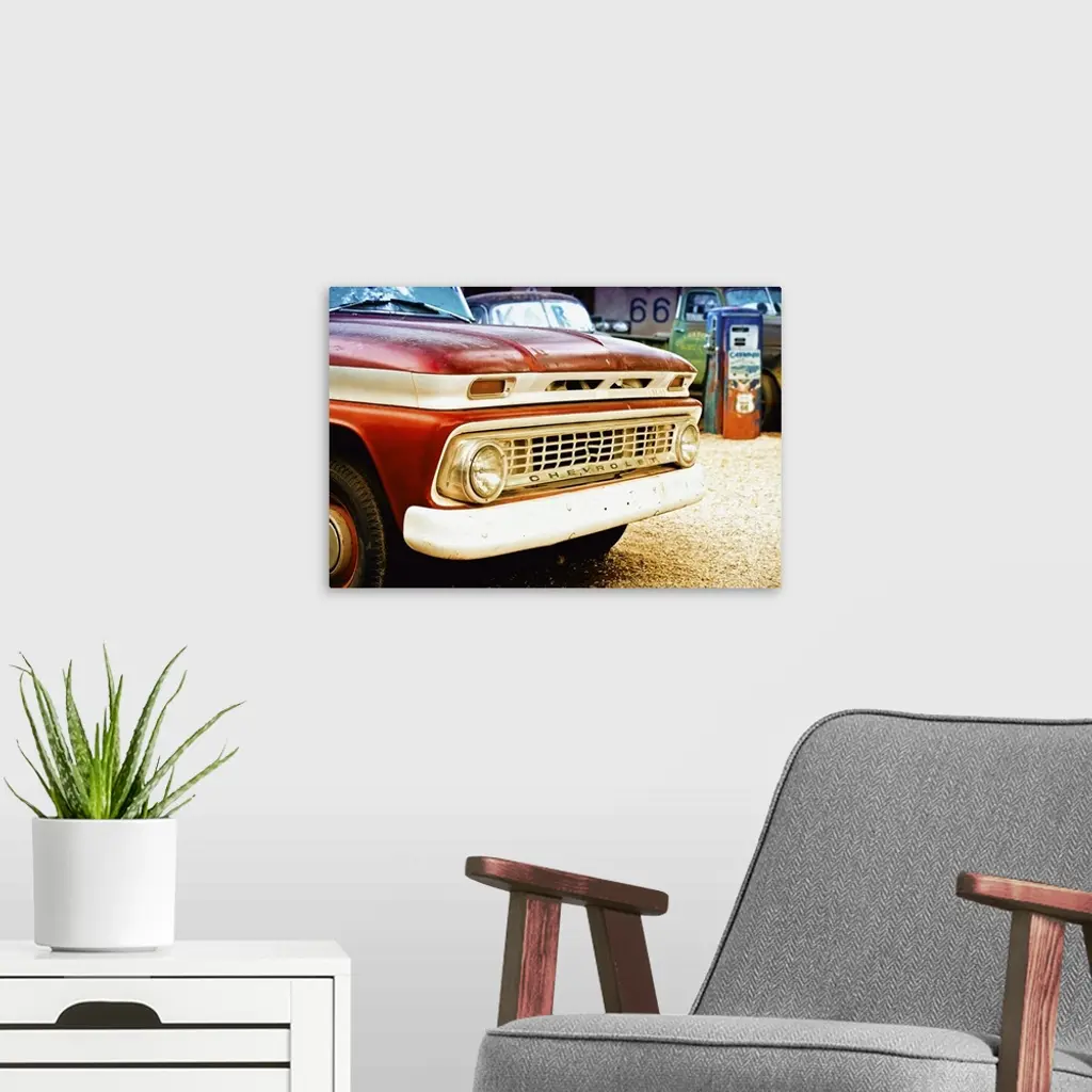 The grille and headlights of a classic Chevy car at a gas station on Route 66.