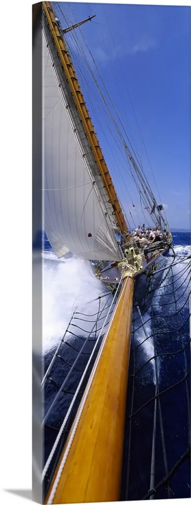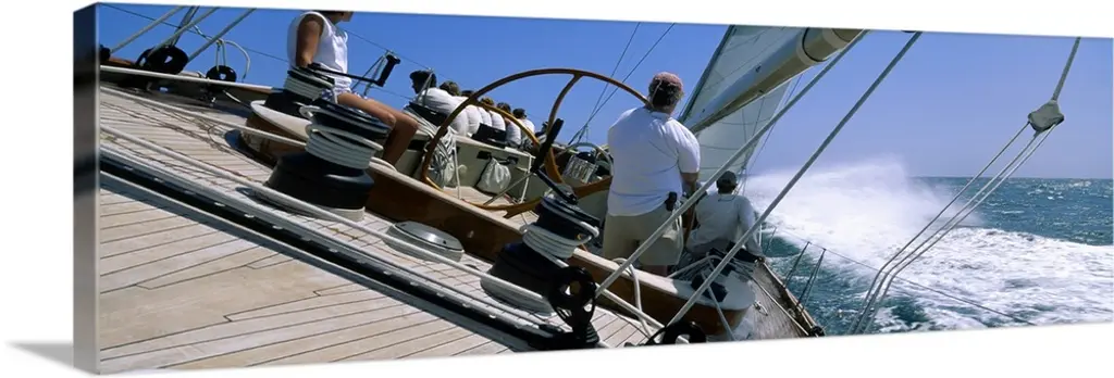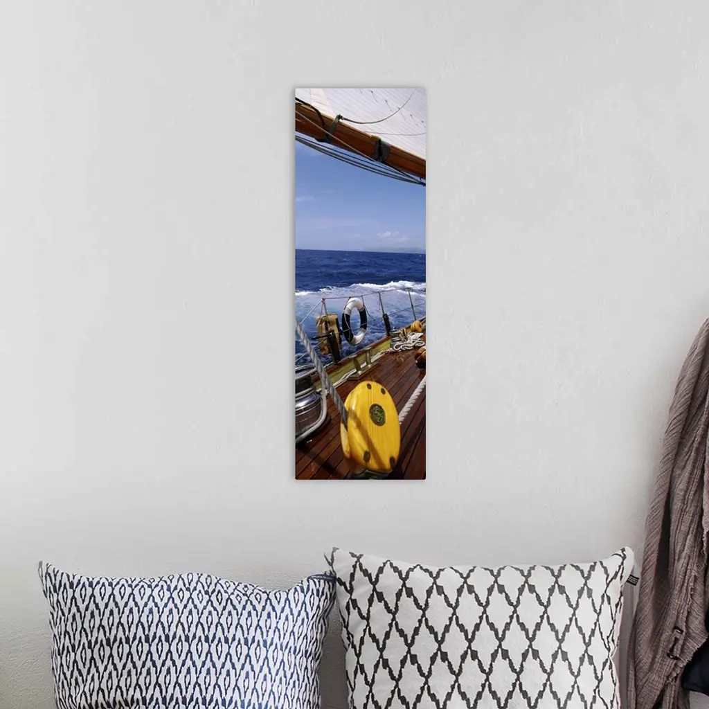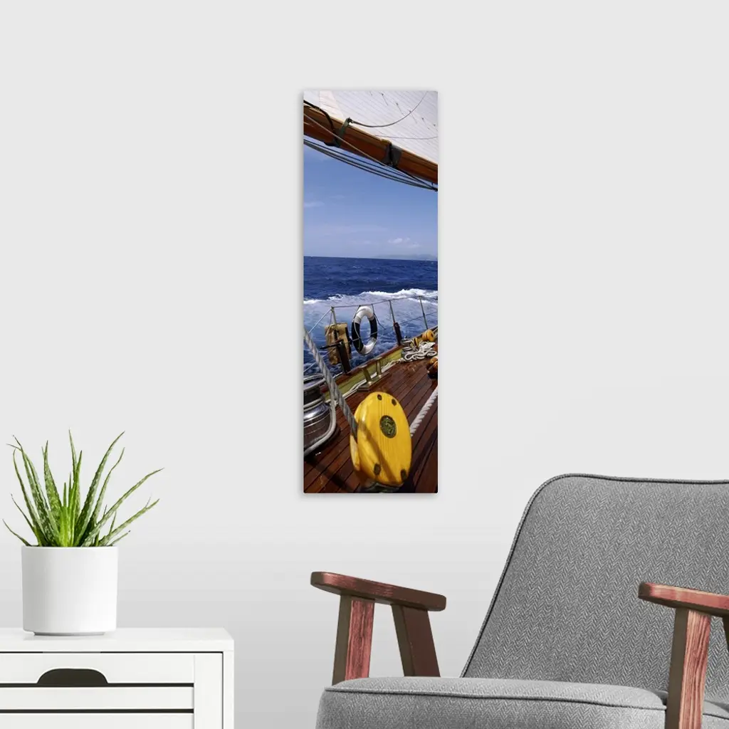 This photograph is taken on a sailboat showing the detail of the deck on the boat and side railing.