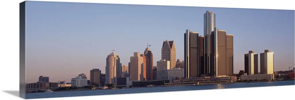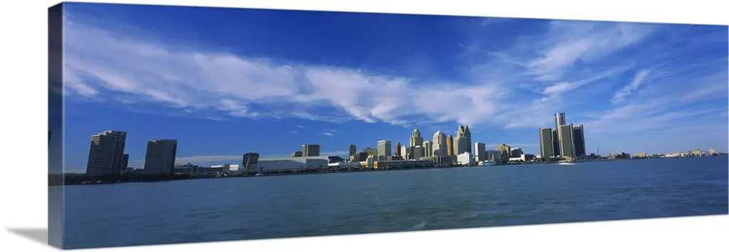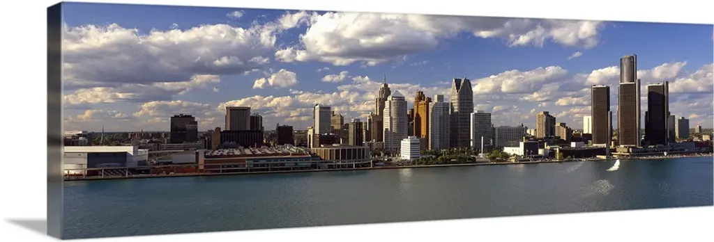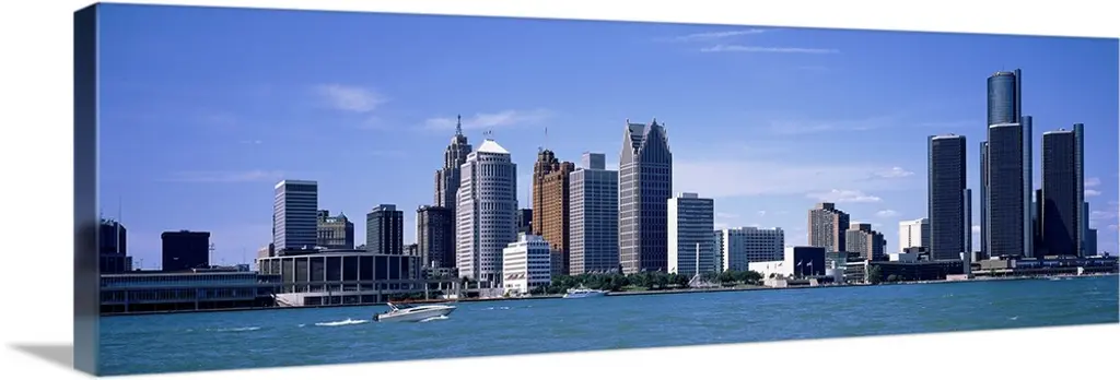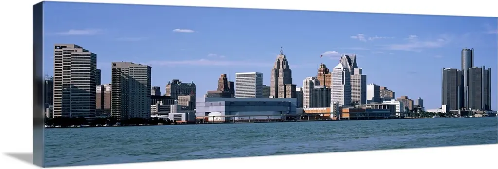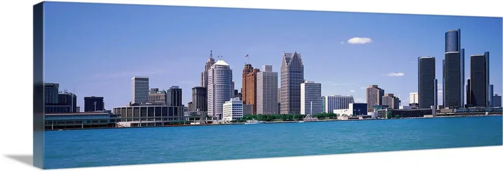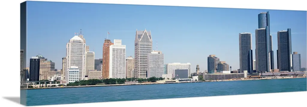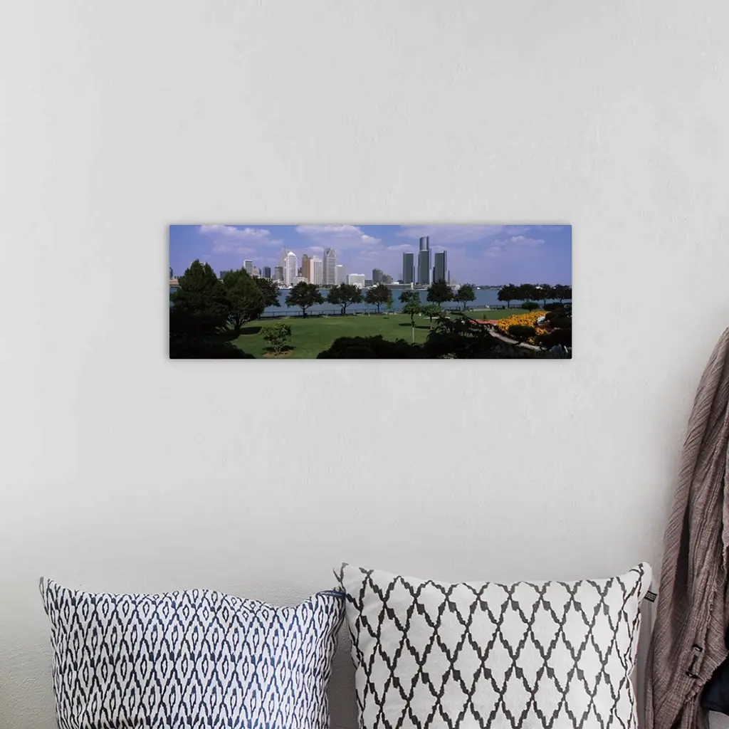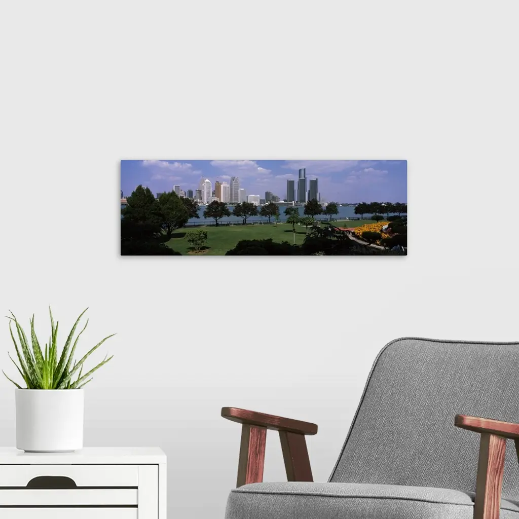 This wall art is a panoramic photograph of the city skyline taken from a park across the water.