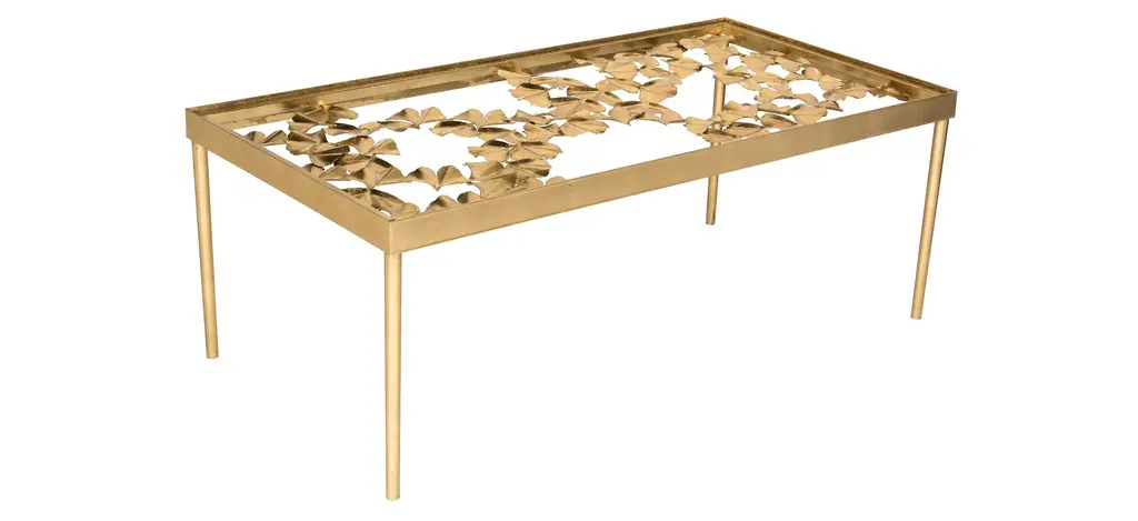 This ginko leaf Devi coffee table was inspired by a handcrafted piece created by master goldsmiths for an Italian princess' Tuscan estate. Ethereal and timeless, this modern heirloom's antique gold finish, glass top and sculptural detail bring visual splendor to any decor.