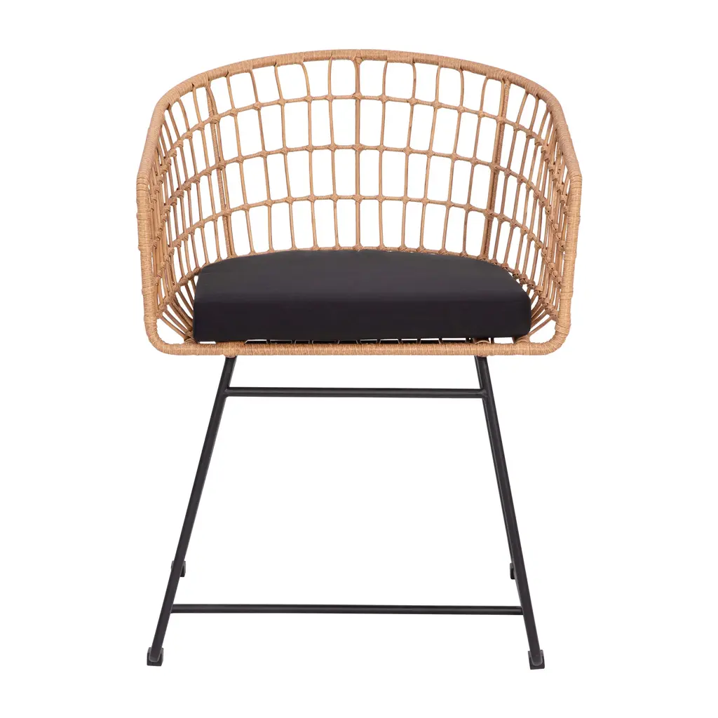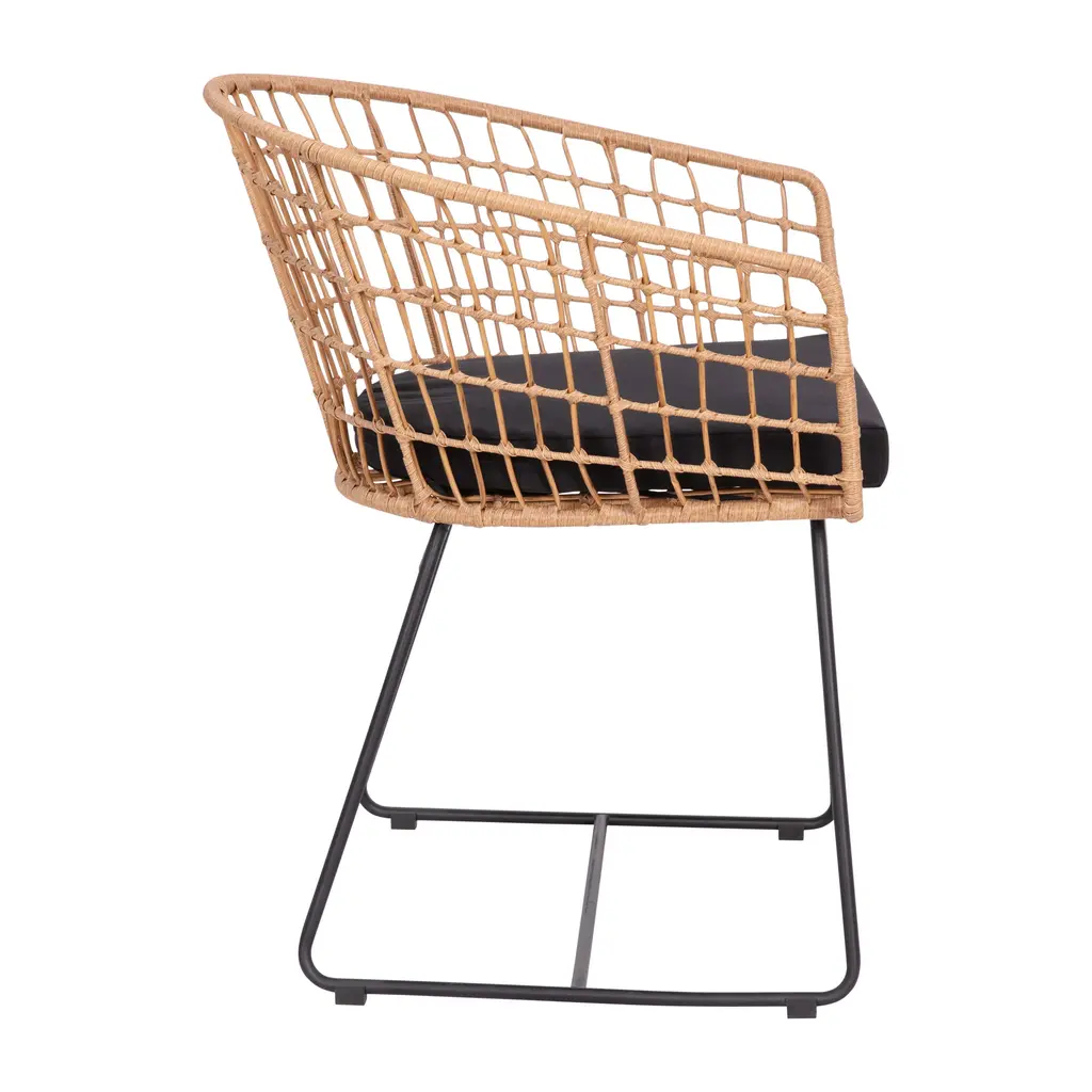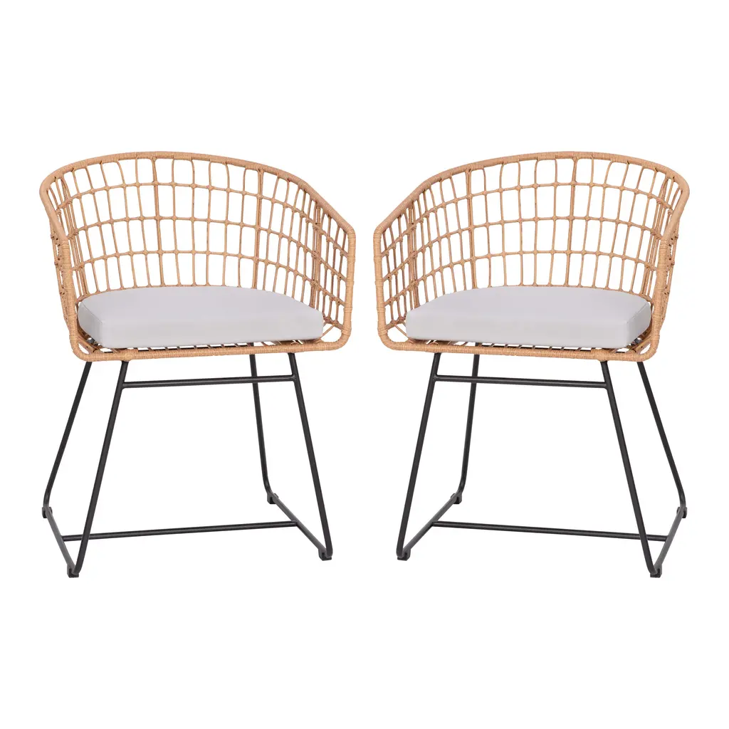 Sunny afternoons on the deck or rainy days in the sunroom are much more enjoyable in this set of 2 rattan rope club chairs with plush seat cushions. Gently rounded backs paired with super sturdy metal sled bases give these accent chairs a trendy, boho look that blends in almost any decor. Thickly padded polyester seat cushions with a comfort foam core provide a soft, cozy perch to enjoy your morning coffee or your latest book in complete comfort. Weather and fade resistant materials over powder coated steel frames, wrapped in polyethylene rattan wicker, make these chairs ideal for indoor and outdoor use and accommodate up to 300 lbs. static weight for worry-free seating. Fixed floor glides prevent damage to hard flooring surfaces when used inside so you can move these chairs anywhere in your home without marring your floors. Assembly takes less than 10 minutes per chair and only a damp cloth is needed for cleaning. Zippered removable cushion covers may be hand washed and air dried. Pair this set of chairs with our indoor/outdoor rattan rope table with wood top to make these cushioned club chairs your go-to spot any day of the week.