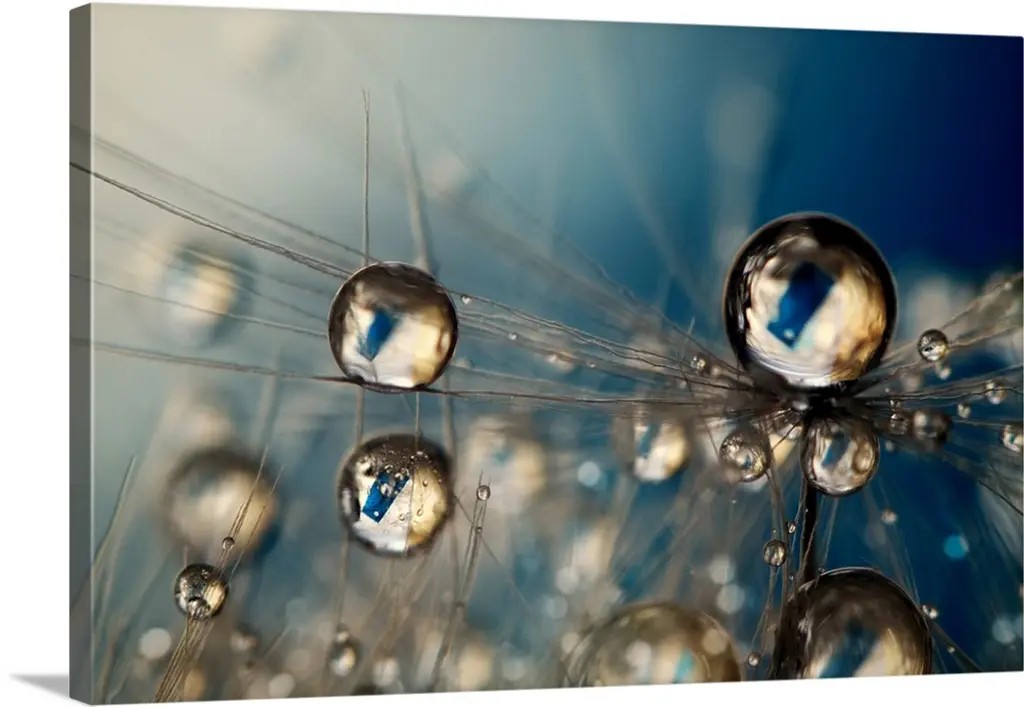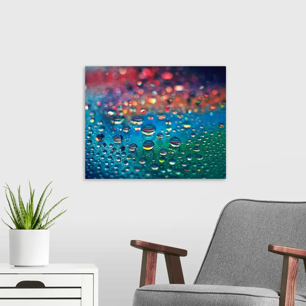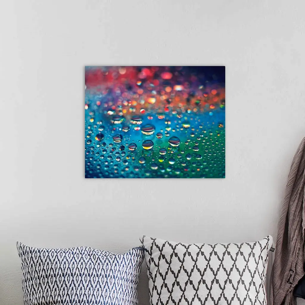 Landscape, close up photograph of dew drops of various sizes on a rainbow colored surface, using differential focus, in focus, out focus.