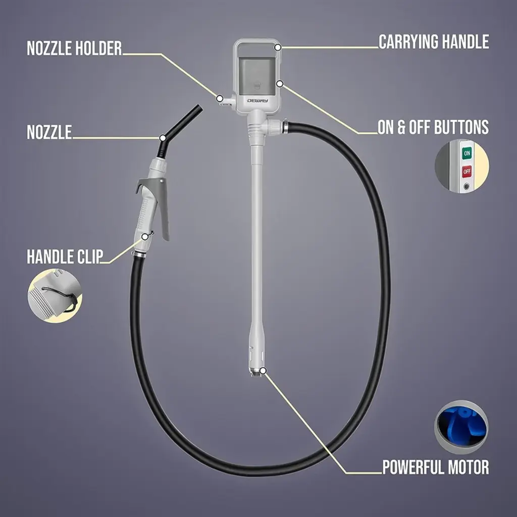 The greatest fuel-powered tools deserve the best fueling system. Treat your tools right with the DeWay Battery-Powered Fuel Transfer Pump with User-Operated Nozzle. Pump non-corrosive liquids in your equipment with the DeWay Battery-Powered Liquid Transfer Pump with User-Operated Nozzle. This fluid pump works with several types of machine-powering liquids like gasoline, kerosene, and diesel. The long, flexible hose on the battery powered fuel transfer pump makes siphoning liquids easy and comfortable. And with the sleek, user-friendly construction, you never have to worry about spills or instability. Its portable, lightweight design makes this portable fuel pump easy to use wherever you need it. Made from durable, high-quality plastic, this pump is built to last and is a reliable part of your toolkit. Your tools help you get the job done right. Fuel them up right with the DeWay Battery-Powered Gasoline Transfer Pump with User-Operated Nozzle.