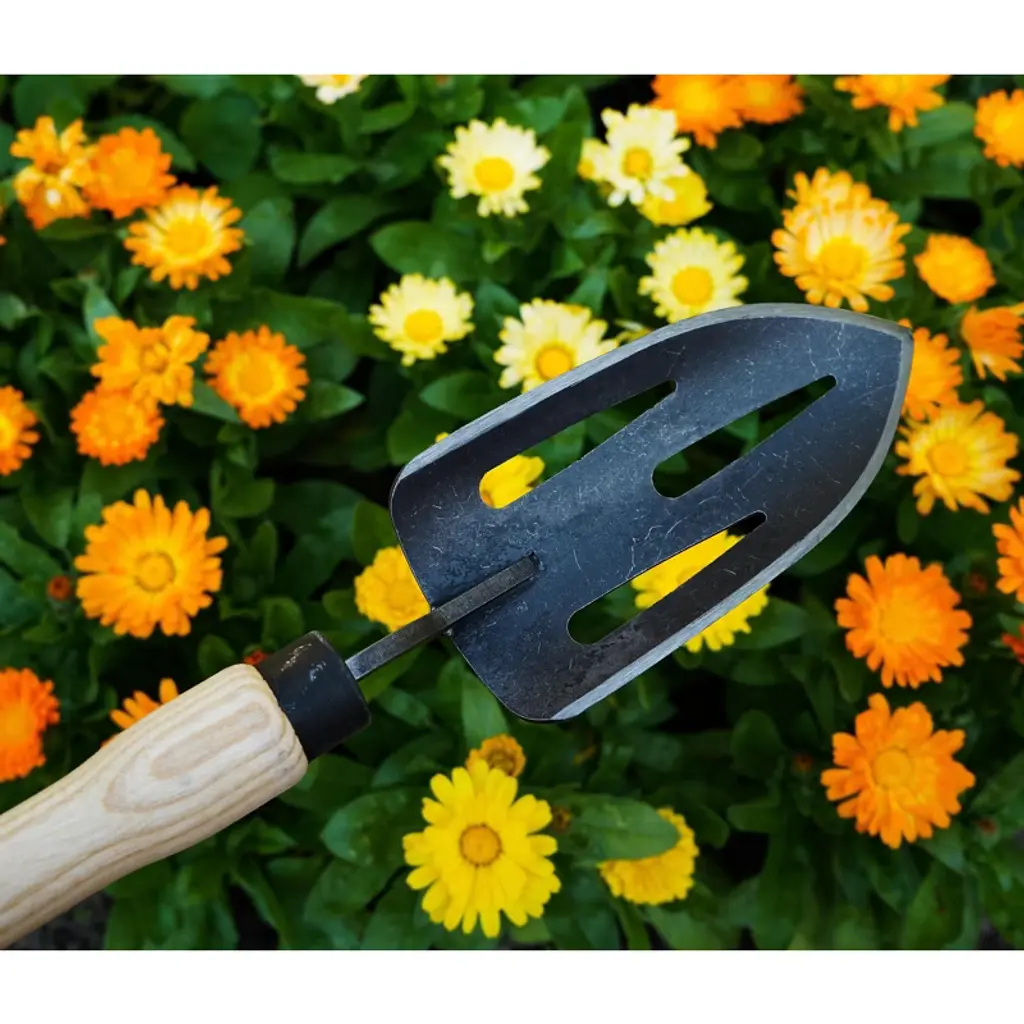 The DeWit Sieve Trowel is a game-changer for gardeners who want to dig, cut, and sift all in one tool. Its sharpened edges slice through roots and tough soil, while the slotted design allows you to sift out rocks and debris effortlessly. Whether you're removing weeds, breaking up clay soil, or mixing fertilizer into the earth, this versatile tool gets the job done with ease. Made from heat-treated boron steel for ultimate durability, it features a comfortable ash wood handle. Handcrafted in Holland, this high-quality trowel is backed by a lifetime guarantee.