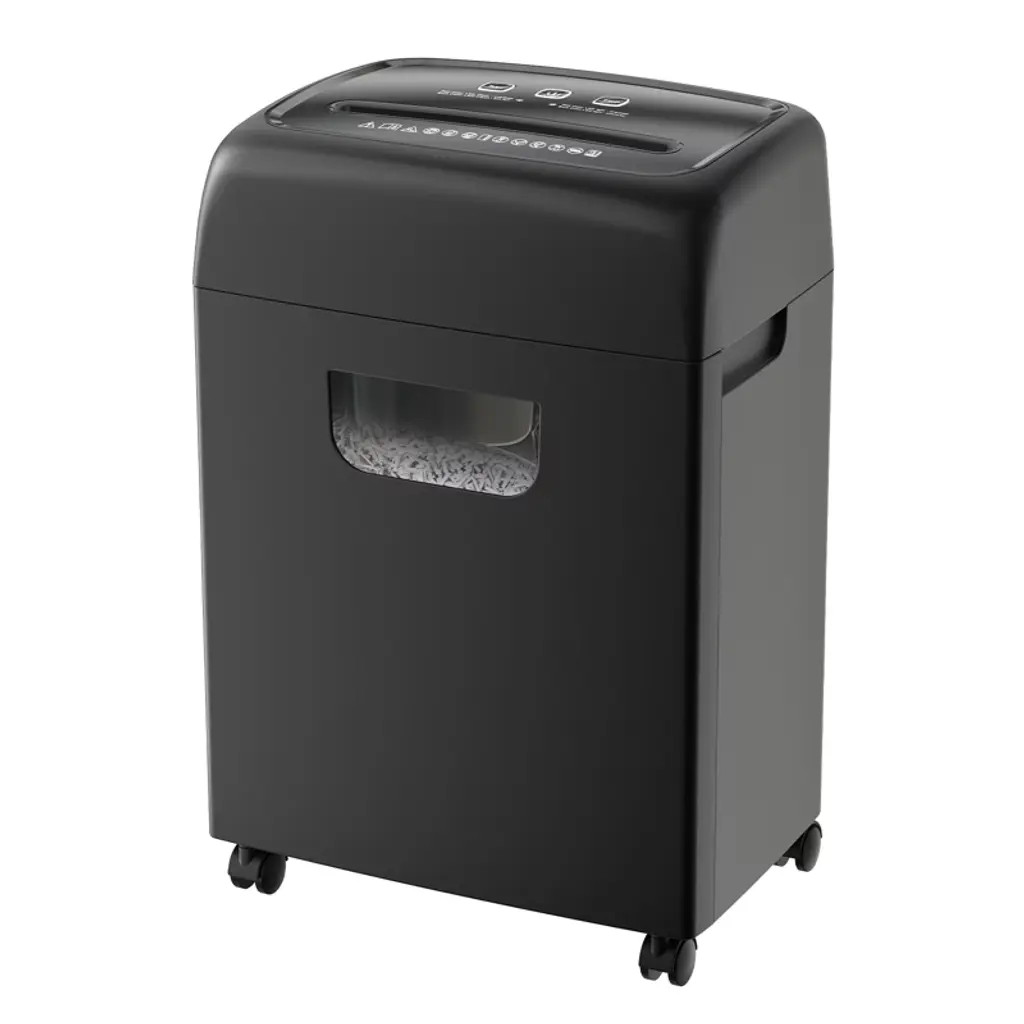 Dexmalle shreds up to 18 sheets at a pass as well as small staples and credit cards. It also features an easy pull-out bin with viewing window so you can see when to empty. Casters let you move it from room to room with ease. A unique Slide-Top housing hides the paper entry slot and electronics for a smooth sleek functional surface. The extra-large 5.28-gallon pullout waste bin holds hundreds of shredded pages.