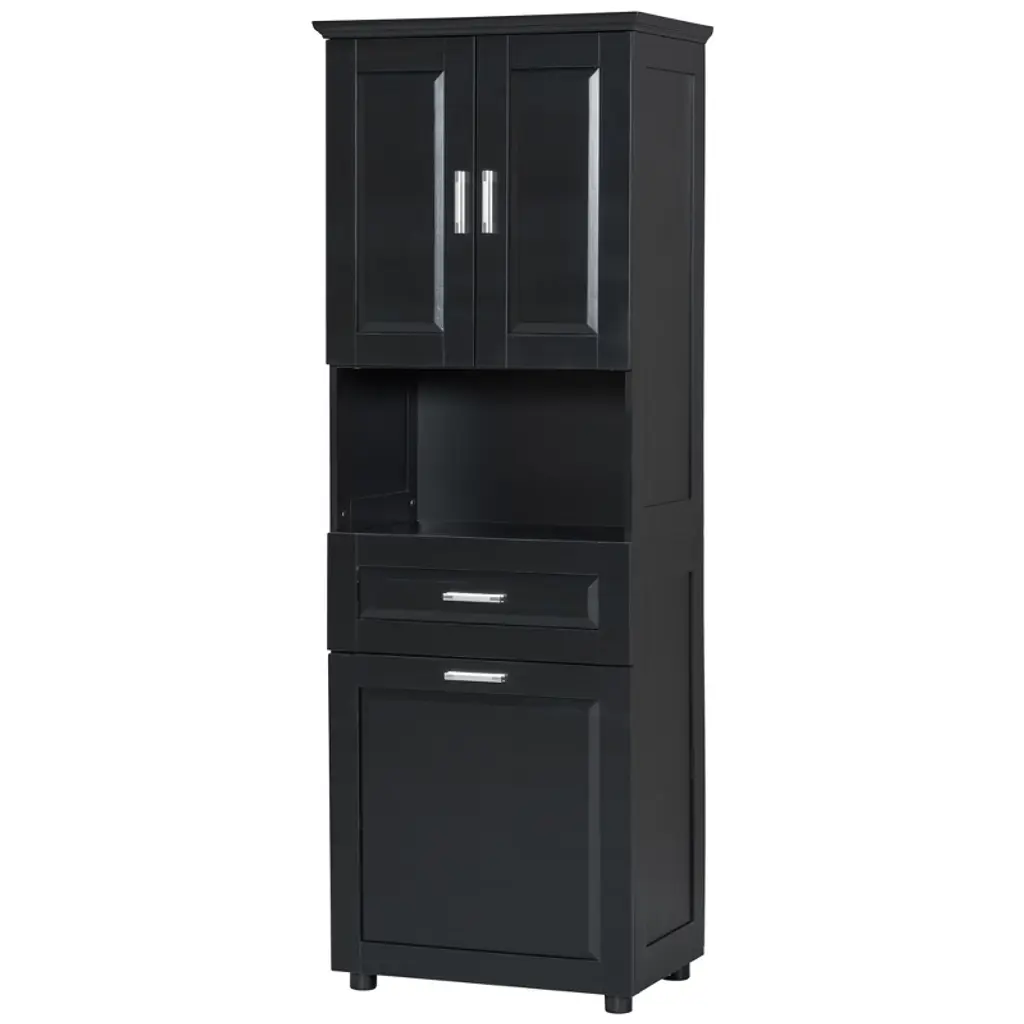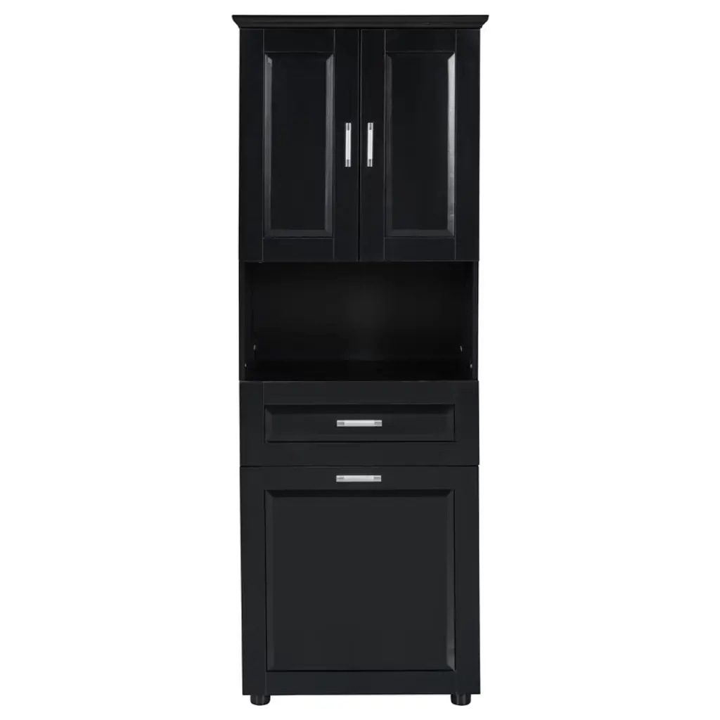 Elevate Your Bathroom with Elegant Storage Upgrade your bathroom with this 67.2-inch tall storage cabinet designed to combine elegance with organization. Featuring 4 doors, a drawer, 3 adjustable shelves, soft-close hinges, and sleek black handles, it adds both function and style. The combination of tempered glass and melamine interior ensures a clean and practical surface, while the ample internal layout helps manage toiletries, towels, and daily essentials with ease. Versatile Storage for Every Need 4 doors and 1 drawer, plus adjustable shelves provide ample space for organizing towels, shampoos, detergents, and more. Customize the layout to suit different item sizes. Stylish & Long-Lasting Materials Features tempered glass, steel handles, and a melamine interior, combining modern looks with lasting durability. Multi-Tier Storage Flexibility Customize your storage with adjustable shelves and drawer. Store towels, hairdryers, cleaning products, and more with ease. Safety Anti-Tip Kit Equipped with anti-tip hardware to provide added safety during everyday use. Flexible Shelf Adjustment Three adjustable shelves support multi-level storage, tailored to your needs. Door Catch for Secure Closure The built-in door shelf provides convenient space for frequently used items, keeping your essentials within easy reach and your cabinet neatly organized. Soft-Close Doors for Peace of Mind Soft-close hinges minimize noise and prevent slamming, creating a quieter, more comfortable home environment. Dual Glass Cabinet Doors Two tempered glass doors with two adjustable shelves allow elegant display and practical storage.