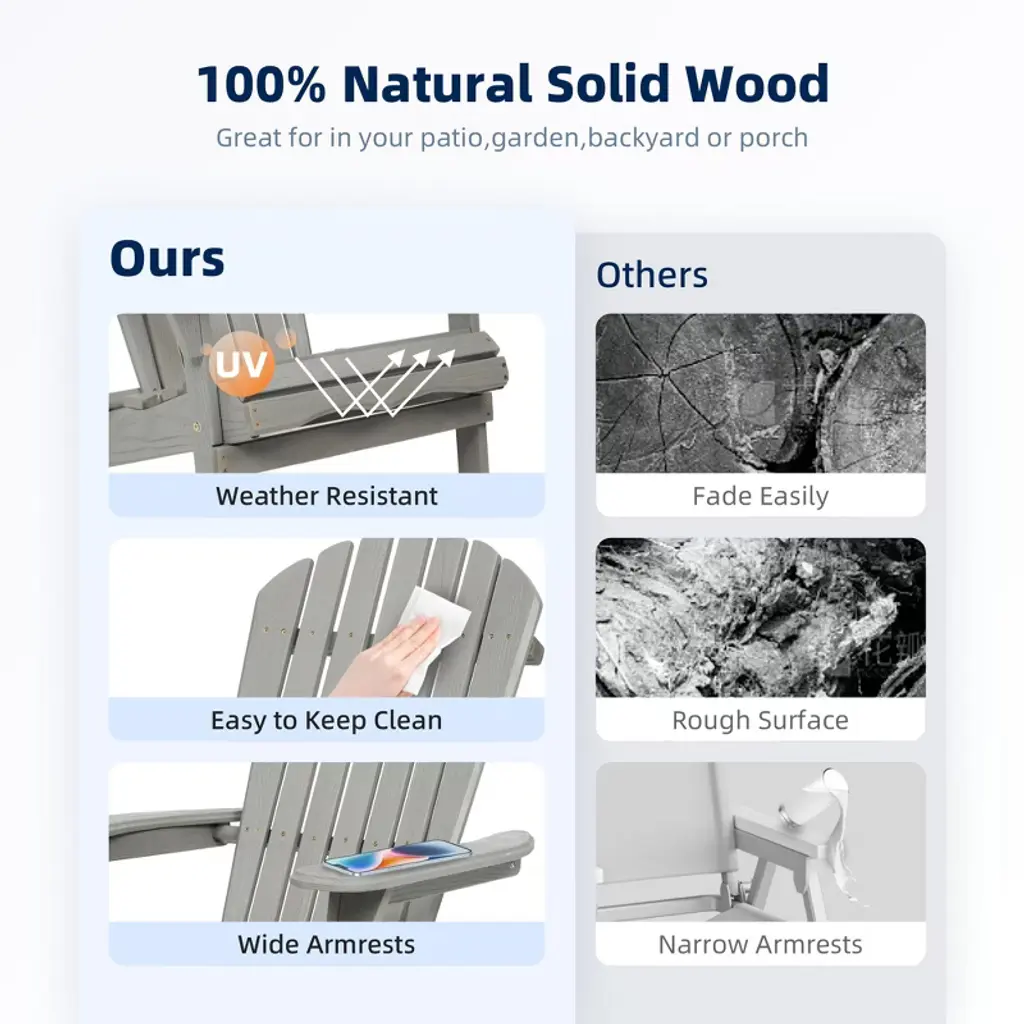 Outdoor folding adirondack chair is using selected solid wood, every piece was well selected and with brushed finishing, giving you premium and royal feel when sitting on it.
