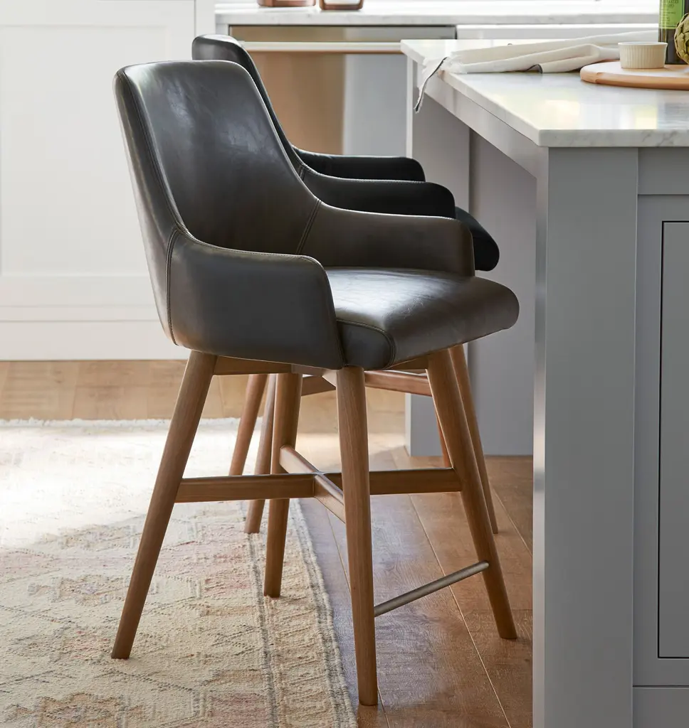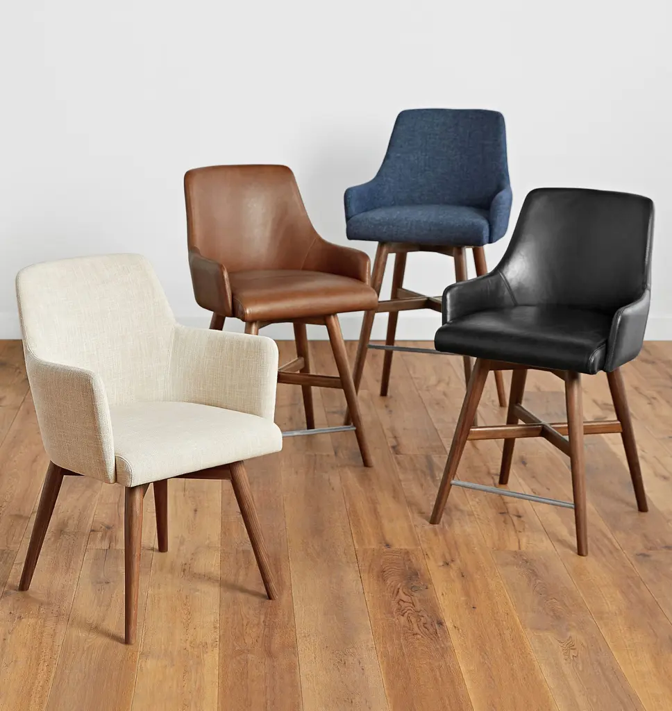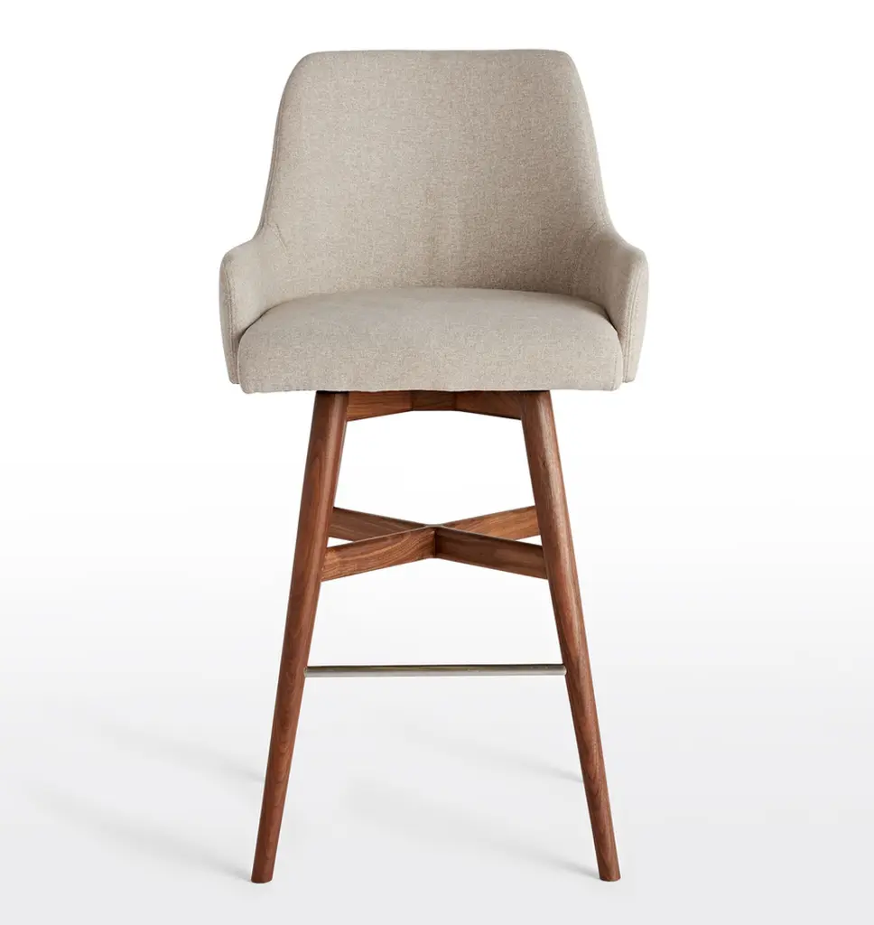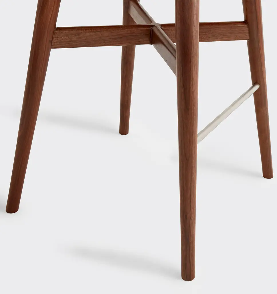Add style and function to your space with our exclusive Mid-Century inspired Dexter Stool, featuring a comfortable contoured curved back and foam-wrapped seat with beautifully tapered solid walnut legs. Customize your Dexter with your choice of premium fabric or leather upholstery.