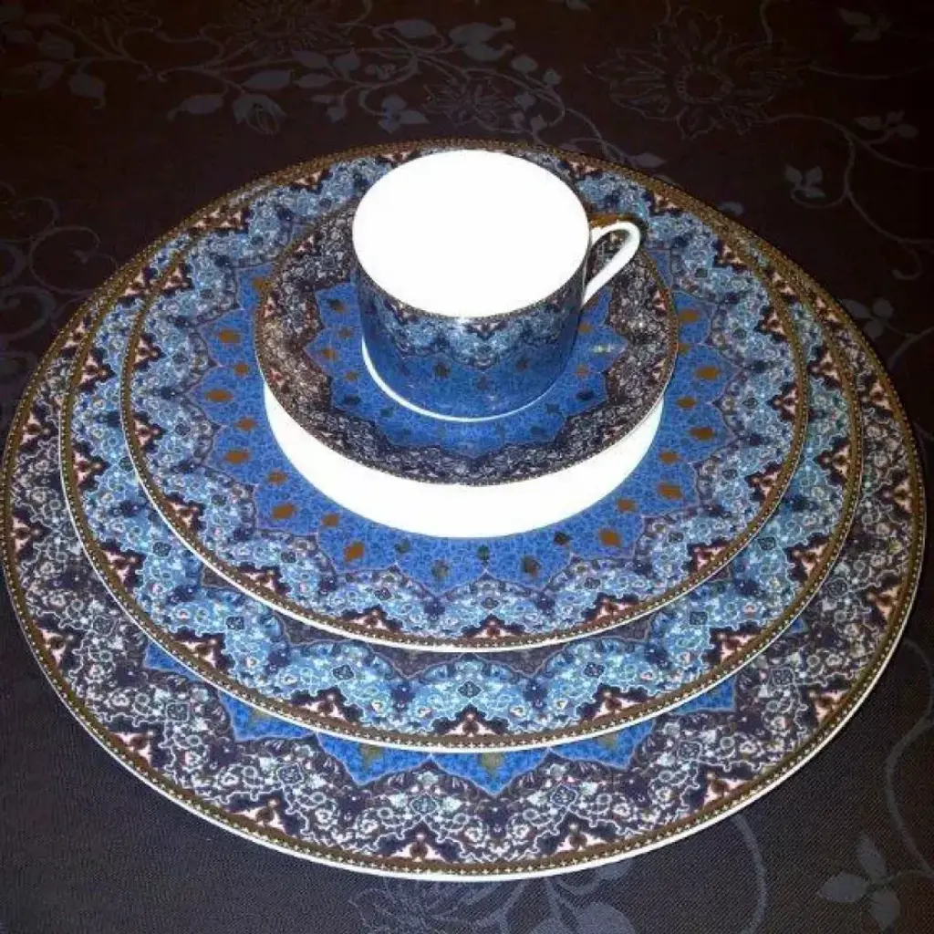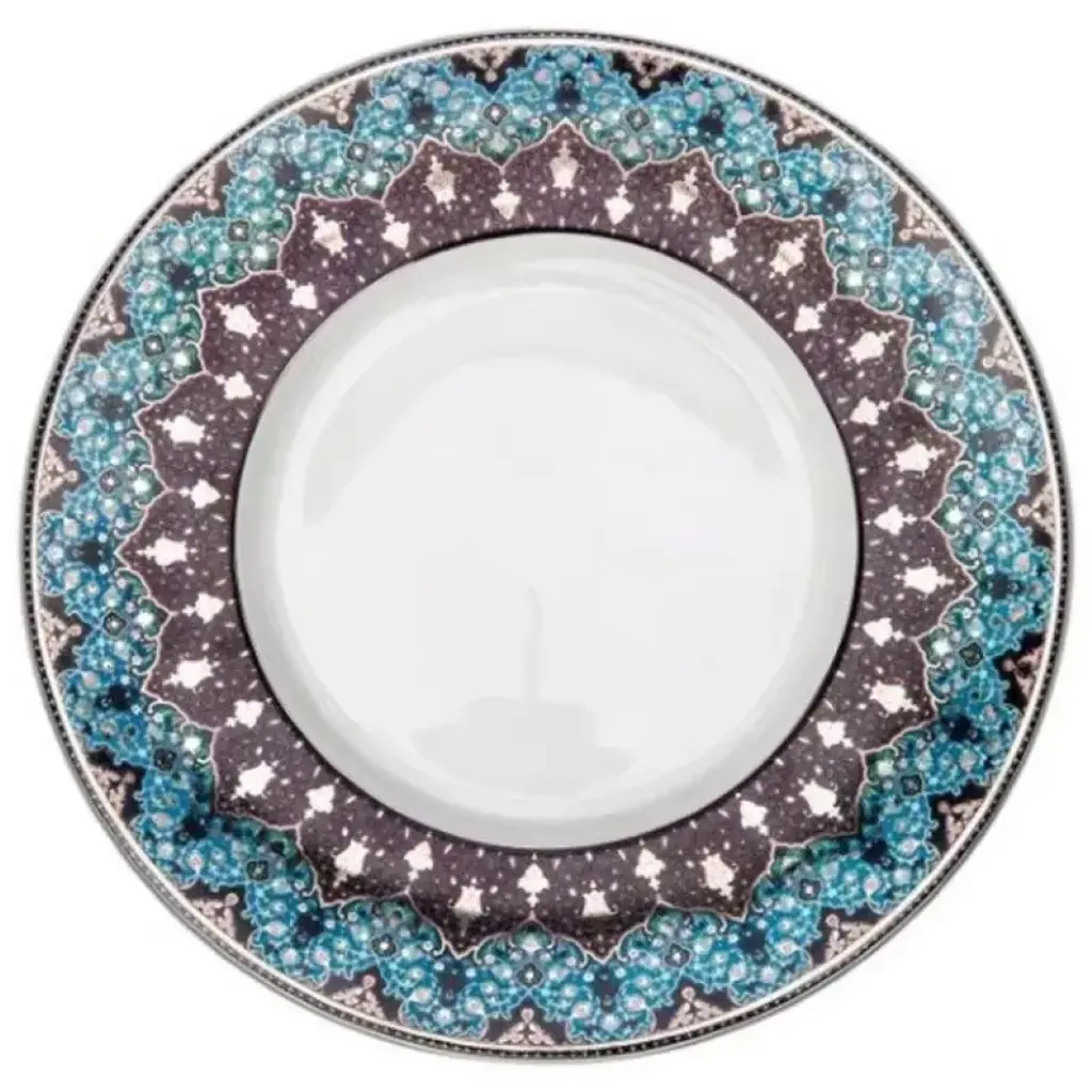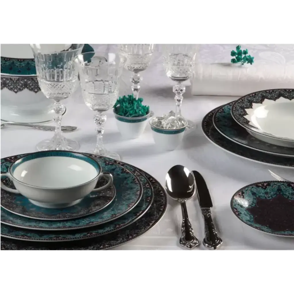 Peacock blue is a fresh new look for the historical Dhara pattern. A glossy ornamentation of platinum adds the mystery and enchantment of starry desert nights. Five piece place setting includes dinner plate, dessert plate, bread & butter plate, teacup and saucer. Founded in 1826, Deshoulières is the leading French porcelain maker today. Their fine white Limoges porcelain is strong enough for everyday use. Their style is well known around the world. The painters and decorators have generations of knowledge. Inspired by trends from both interiors and fashion, their patterns are always refined. Deshoulières embodies a true spirit of French style. With their new collections, Deshoulières delights everyone from homeowners to professional chefs. Invite elegance to your table with Deshoulières.