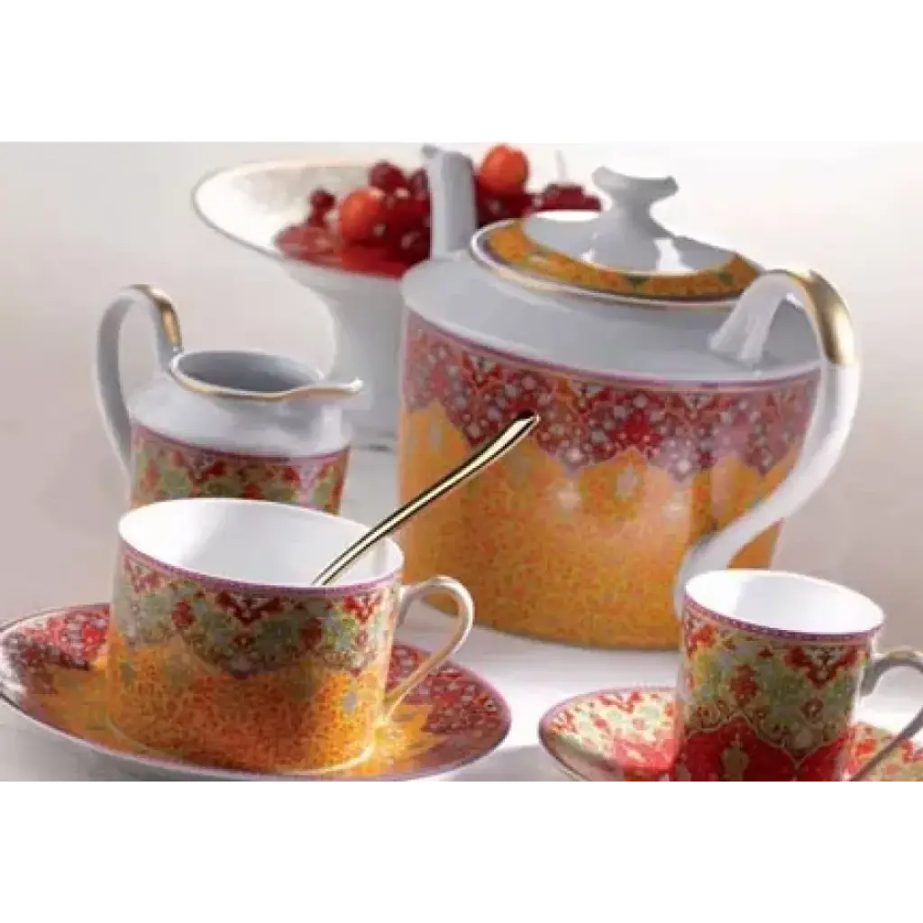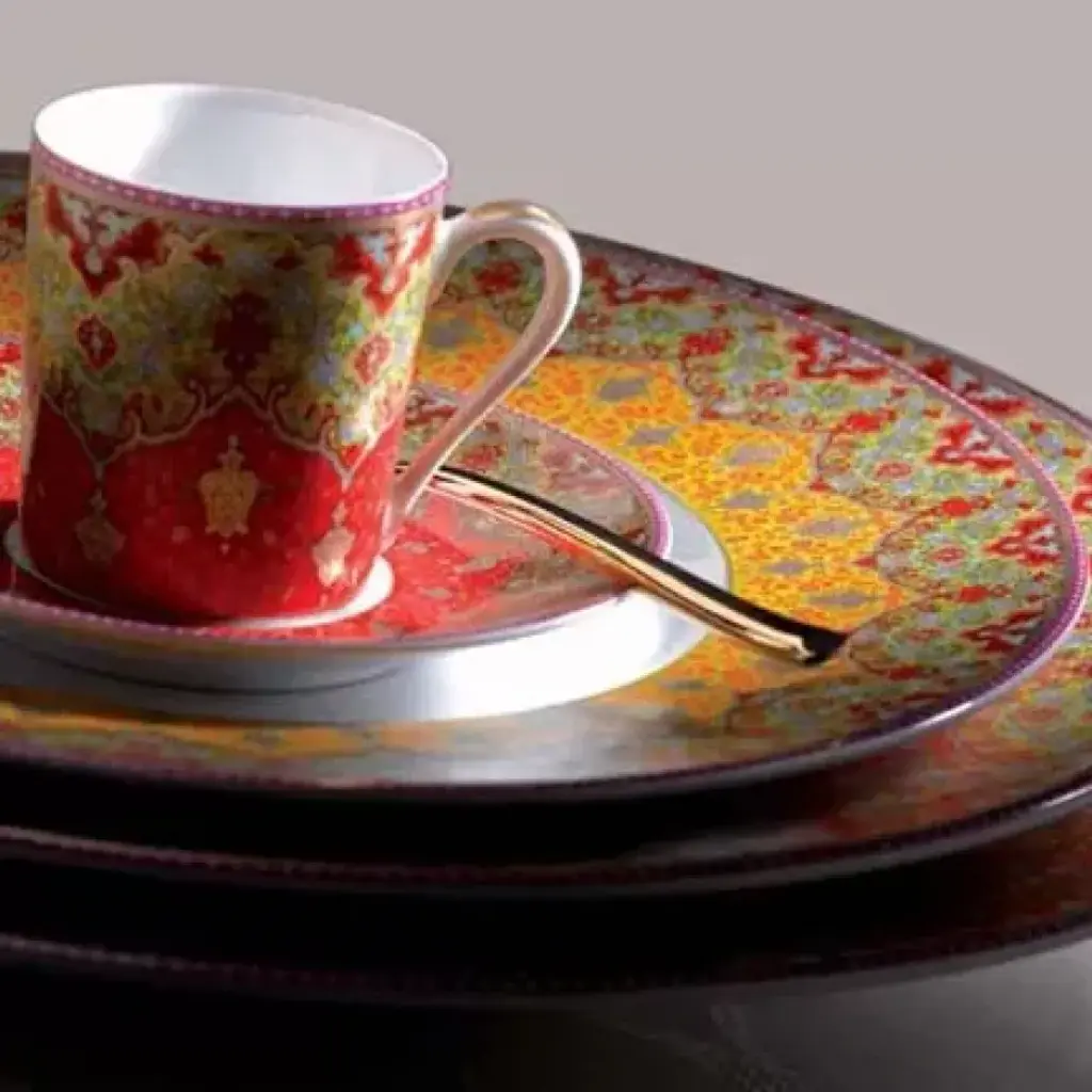 The richly hued Dhara dinnerware is inspired by the decorations of a 17th centry manuscript by Indian poet Saadi. The rich reds and golds are reminiscent of the beautiful saris of Punjab and Kashmir. The bright colors are contrasted with black that is found in traditional carpet weaving in India and the Middle East. Each dish is embellished with matte gold. Five piece place setting includes dinner plate, dessert plate, bread & butter plate, teacup and saucer. Founded in 1826, Deshoulières is the leading French porcelain maker today. Their fine white Limoges porcelain is strong enough for everyday use. Their style is well known around the world. The painters and decorators have generations of knowledge. Inspired by trends from both interiors and fashion, their patterns are always refined. Deshoulières embodies a true spirit of French style. With their new collections, Deshoulières delights everyone from homeowners to professional chefs. Invite elegance to your table with Deshoulières.