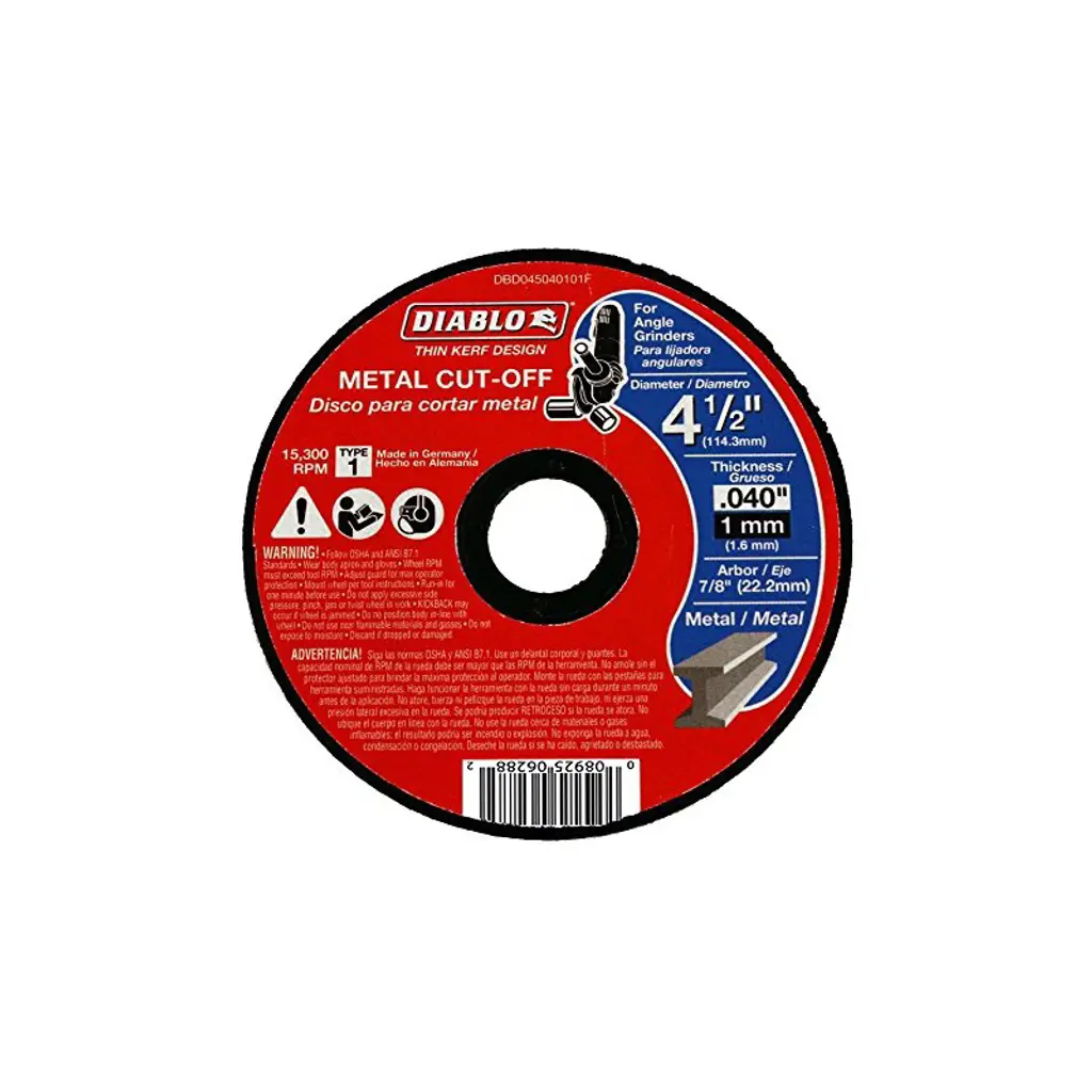 Genuine Diablo replacement part. 4-1/2 in. Metal Cut Off Disc - Thin Kerf. Premium Aluminum Oxide Blend - a superior quality formulation designed for fast material removal and long cutting life. For use on metal applications: steel, stainless, cast iron, sheet metal. Type 1 - Flat.
