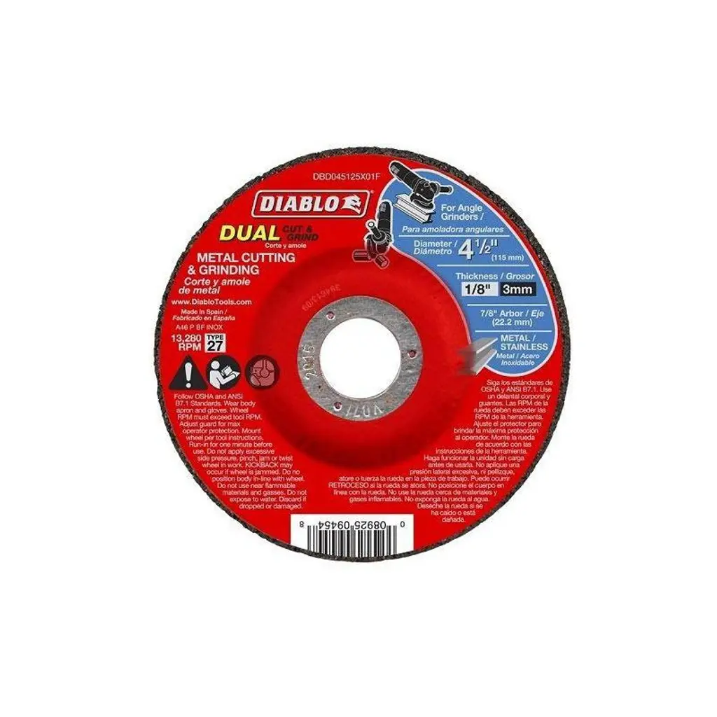 Genuine Diablo replacement part. 4-1/2 in. Metal Dual Cut & Grind Disc - Type 27. Premium Aluminum Oxide Blend - a superior quality formulation designed for fast material removal and long grinding life. Dual Cutting and Grinding Application - a first of its kind, this disc allows you to cut and grind simulataneouly. For use on metal applications: steel, stainless, cast iron, sheet metal.