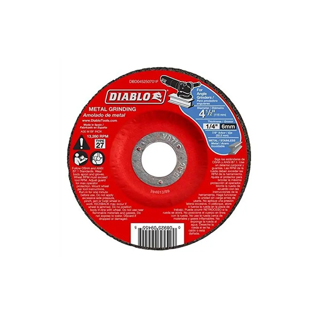 Genuine Diablo replacement part. 5 in. Metal Grinding Disc - Type 27. Premium Aluminum Oxide Blend - a superior quality formulation designed for fast material removal and long grinding life. For use on metal applications: steel, stainless, cast iron, sheet metal. Type 27 - Depressed Center.