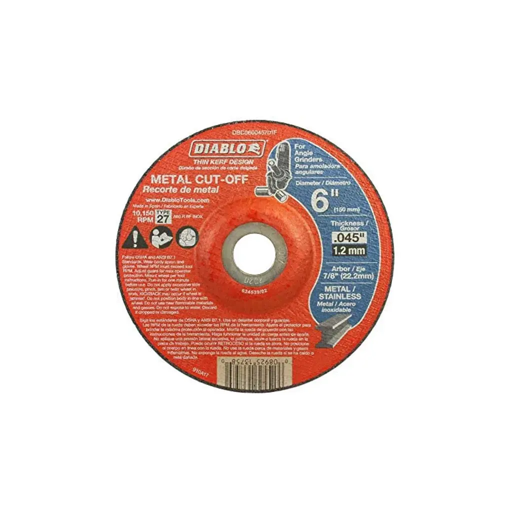 Genuine Diablo replacement part. 6 in. Type 27 Metal Cut-Off Disc. Premium Aluminum Oxide Blend - a superior quality formulation designed for fast material removal and long cutting life. Thin Kerf Design - provides for a thin cut; draws less power/less resistance; and allows your power tool to work at its full potential. For use on metal applications: steel, stainless, cast iron, sheet metal.