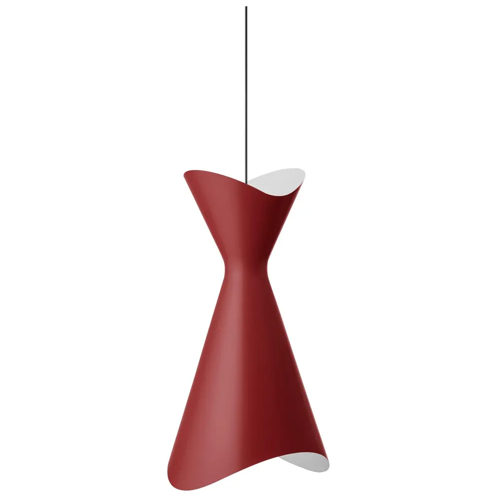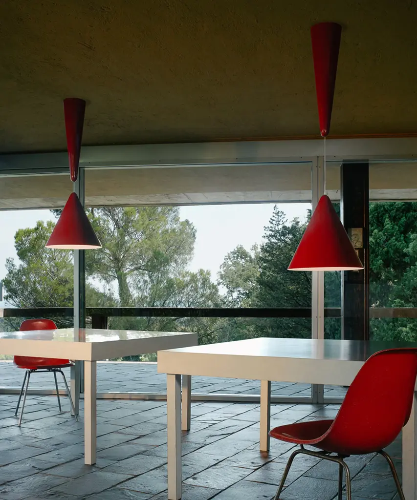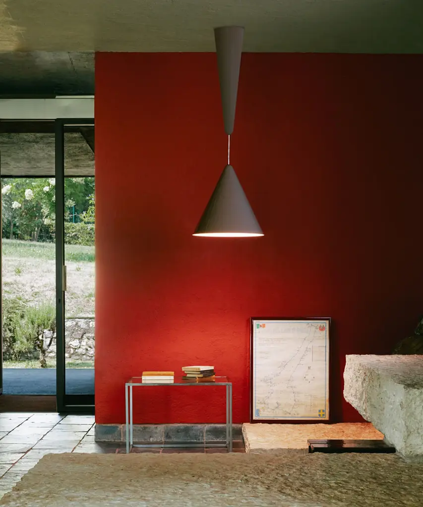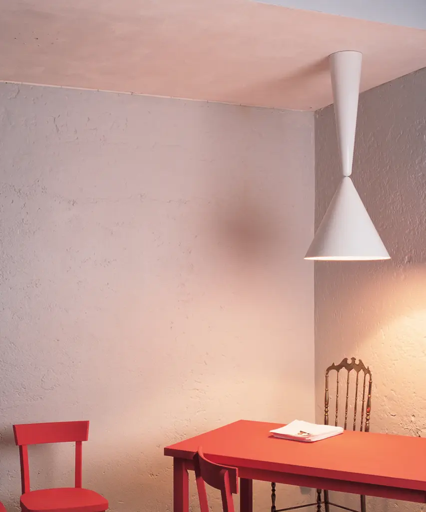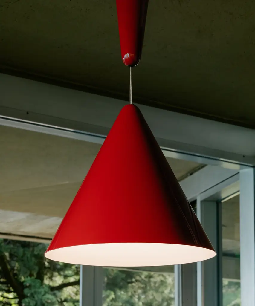A moveable pendant light designed by Achille Castiglioni producing direct lighting, composed of a ceiling rose and diffuser. The re-edition design is made of aluminum with external paint in 3 finish options: shiny white, beaver brown, and cherry red, while the inside of the diffuser is a glossy white finish. The diffuser may be adjustable vertically using its cable reel within the ceiling canopy. Behind the Design: Much like the game that inspired its name, Achille imagined a light that could move up and down via a pulley system, so that the user could adjust its height to their preference by extending or shortening the distance between the two cones. "A hanging lamp composed of two cones – one contains the light source; the other fixed to the ceiling, conceals a spool mechanism." - Giovanna Castiglioni This authentic design is produced in Italy exclusively by Flos.